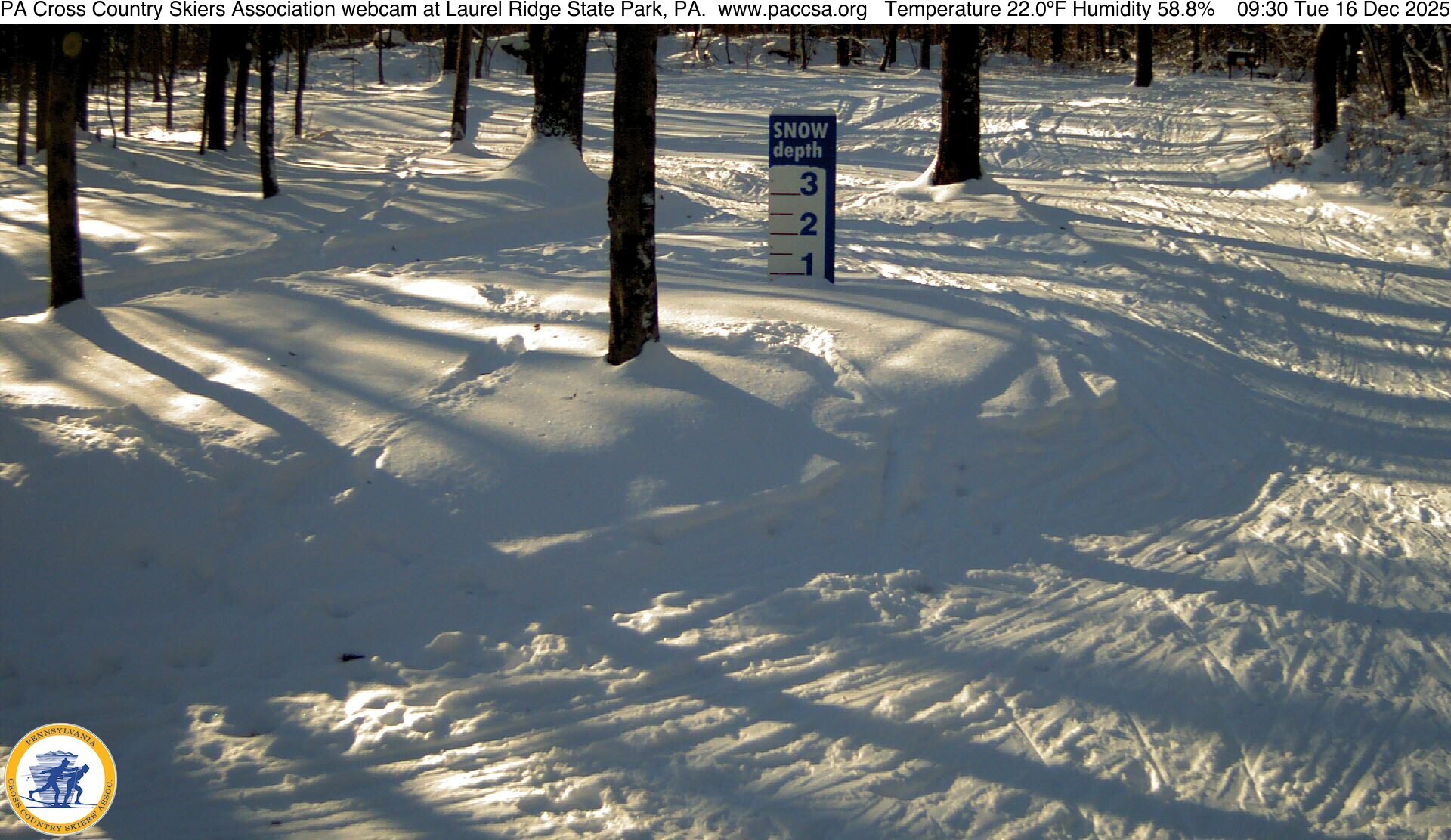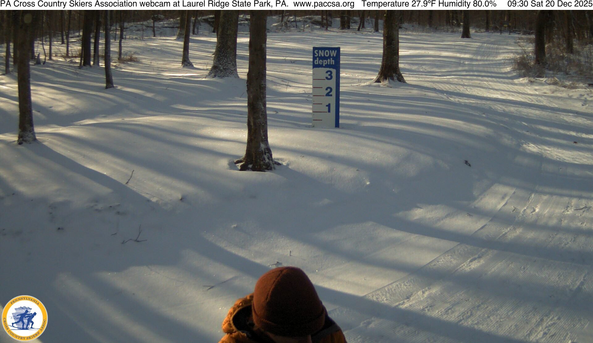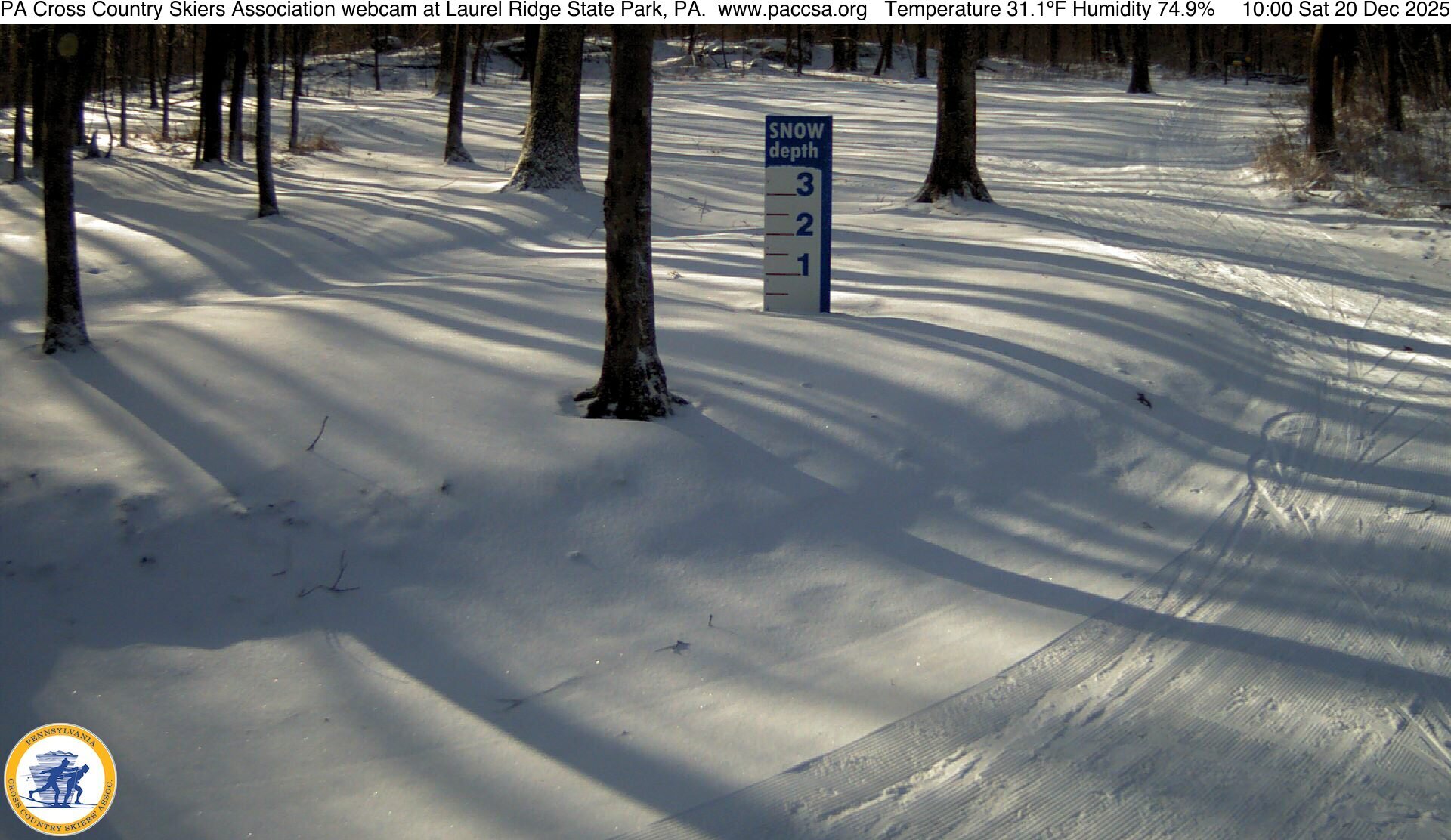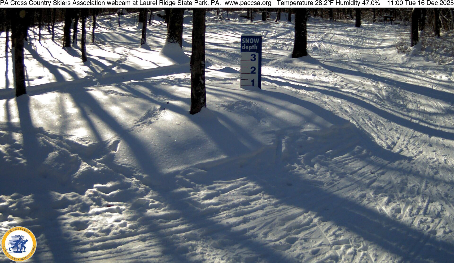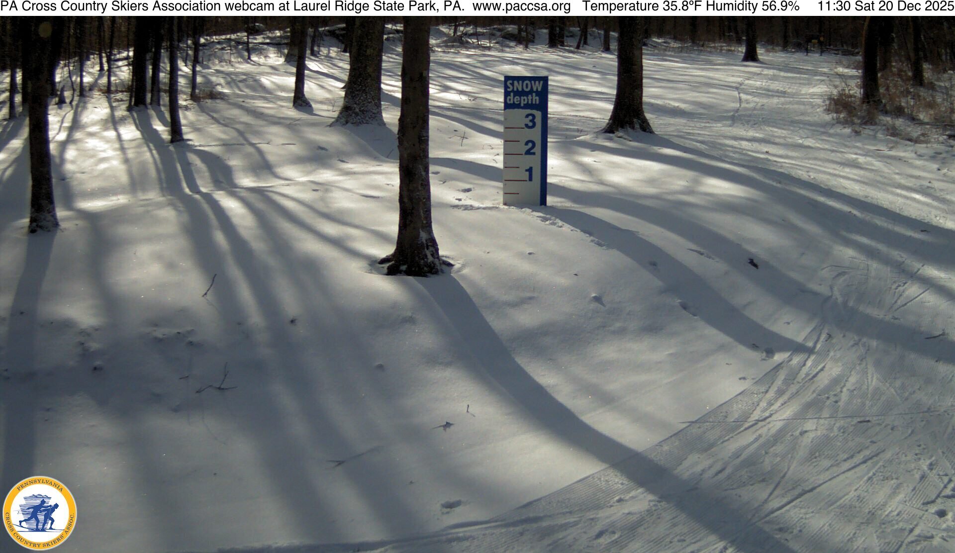 The webcam at Laurel Ridge State Park cross country ski area is owned and maintained by PACCSA, with the support of DCNR and donations from the public. Thank you to everyone who has contributed. The webcam operates from fall to spring, taking a photo of the ski area every half hour from sunrise to sunset. The ground elevation where it is sited is 852 m, 2795 ft.