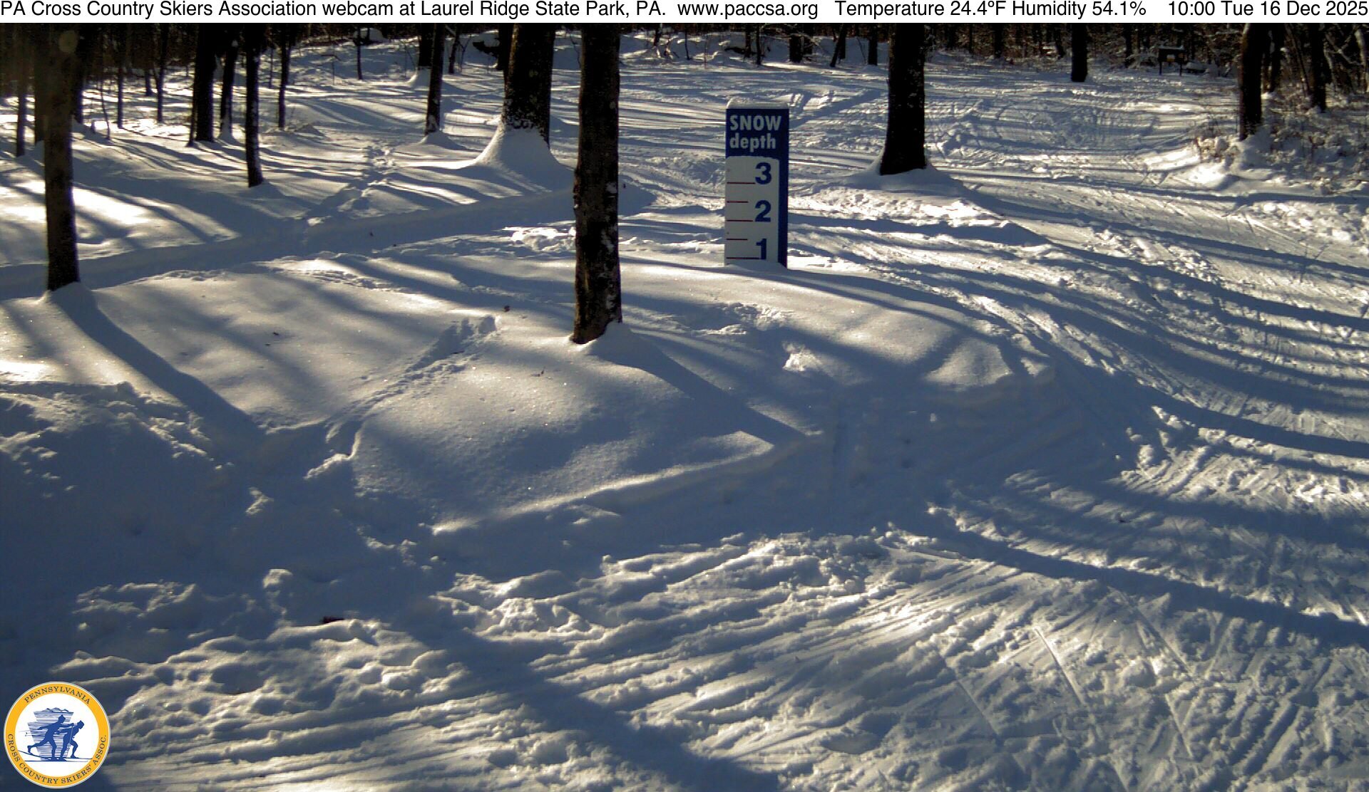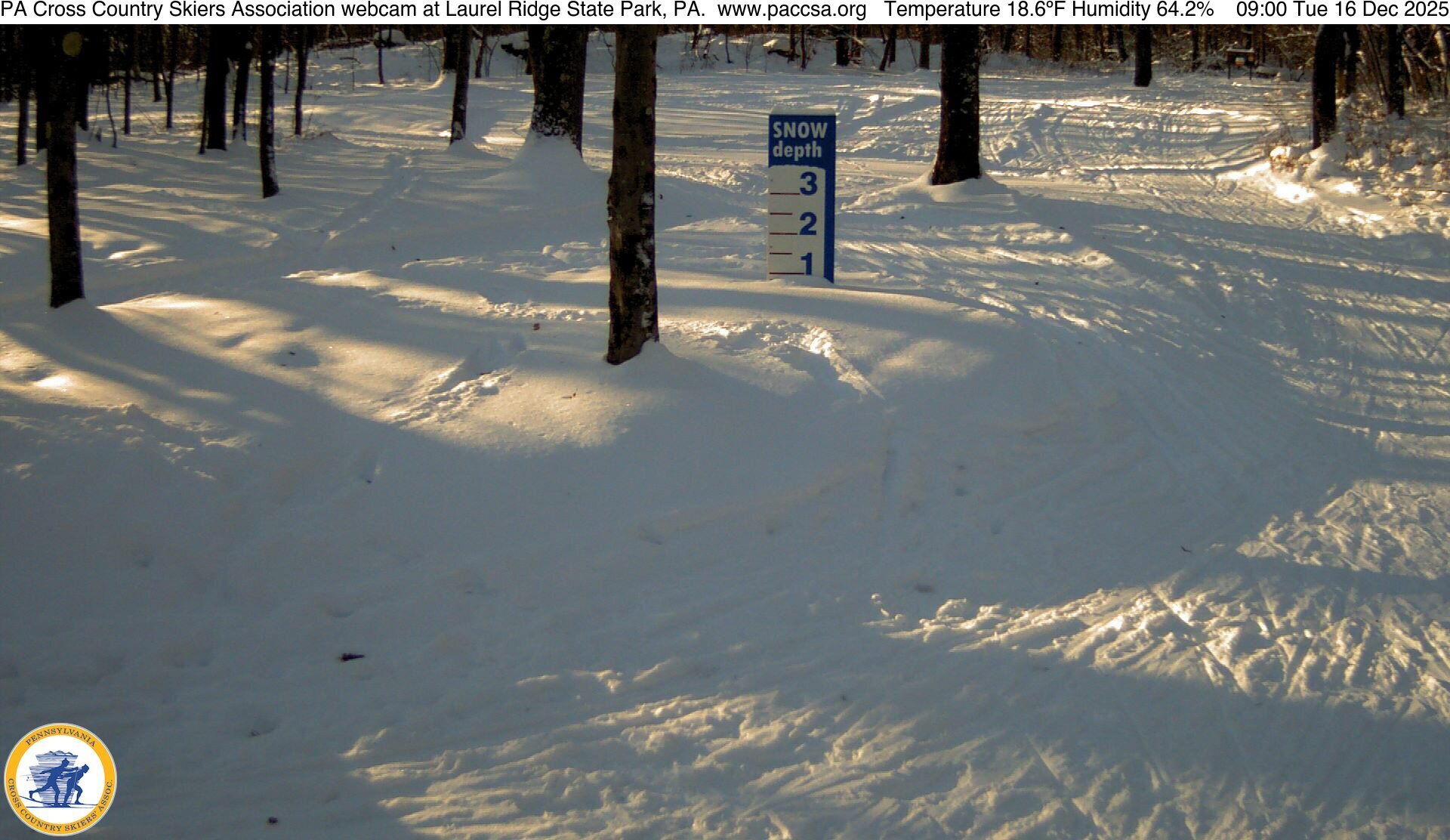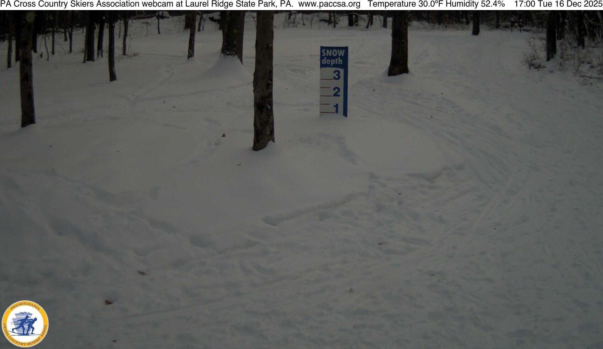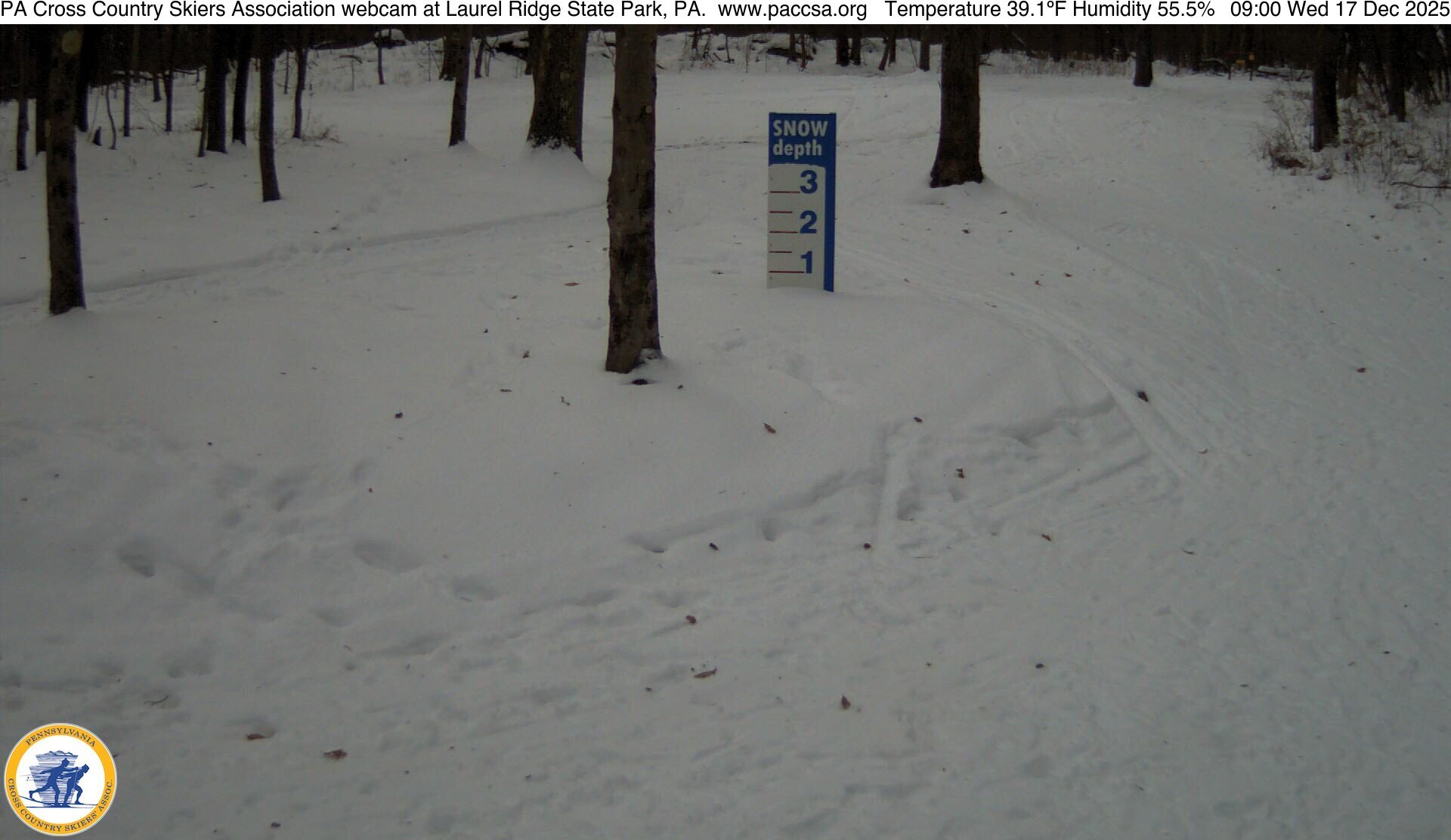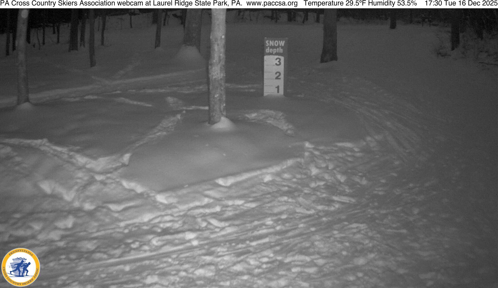 The webcam at Laurel Ridge State Park cross country ski area is owned and maintained by PACCSA, with the support of DCNR and donations from the public. Thank you to everyone who has contributed. The webcam operates from fall to spring, taking a photo of the ski area every half hour from sunrise to sunset. The ground elevation where it is sited is 852 m, 2795 ft.