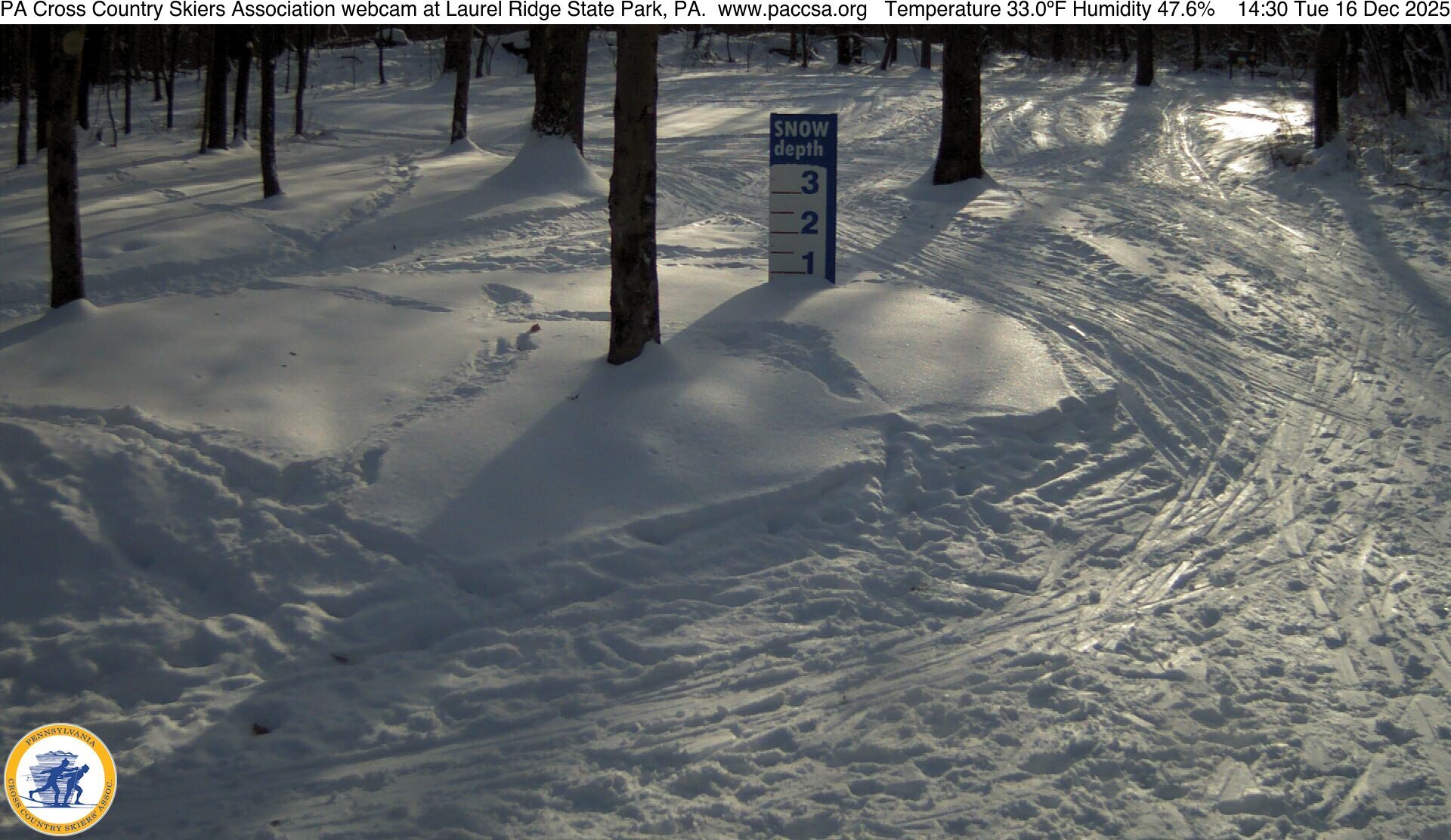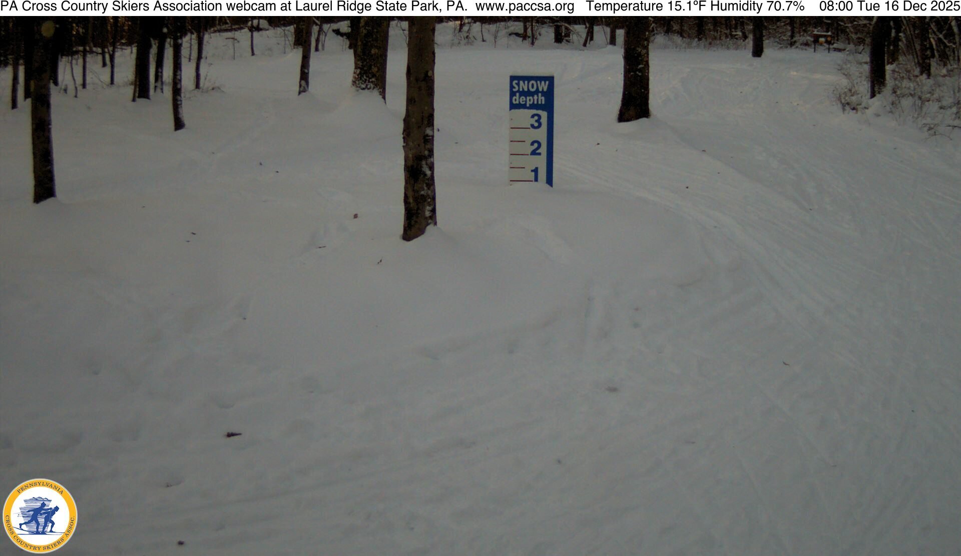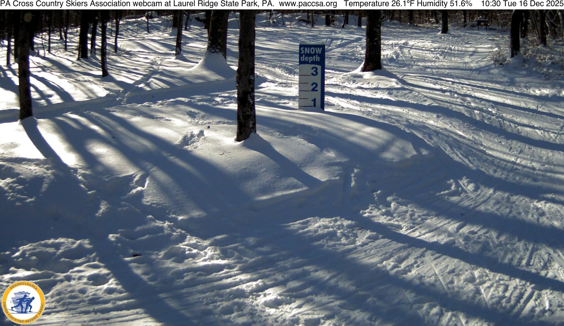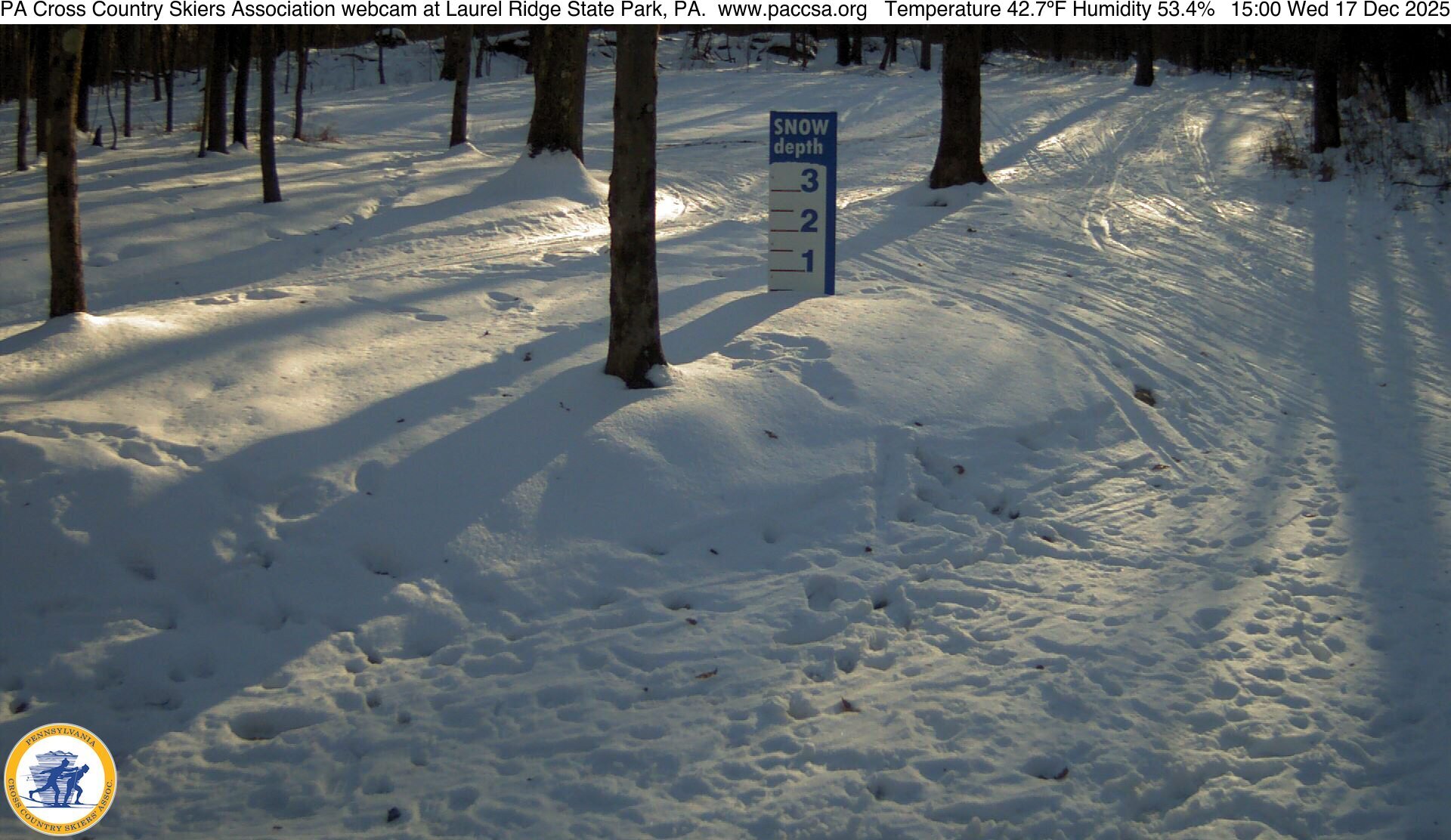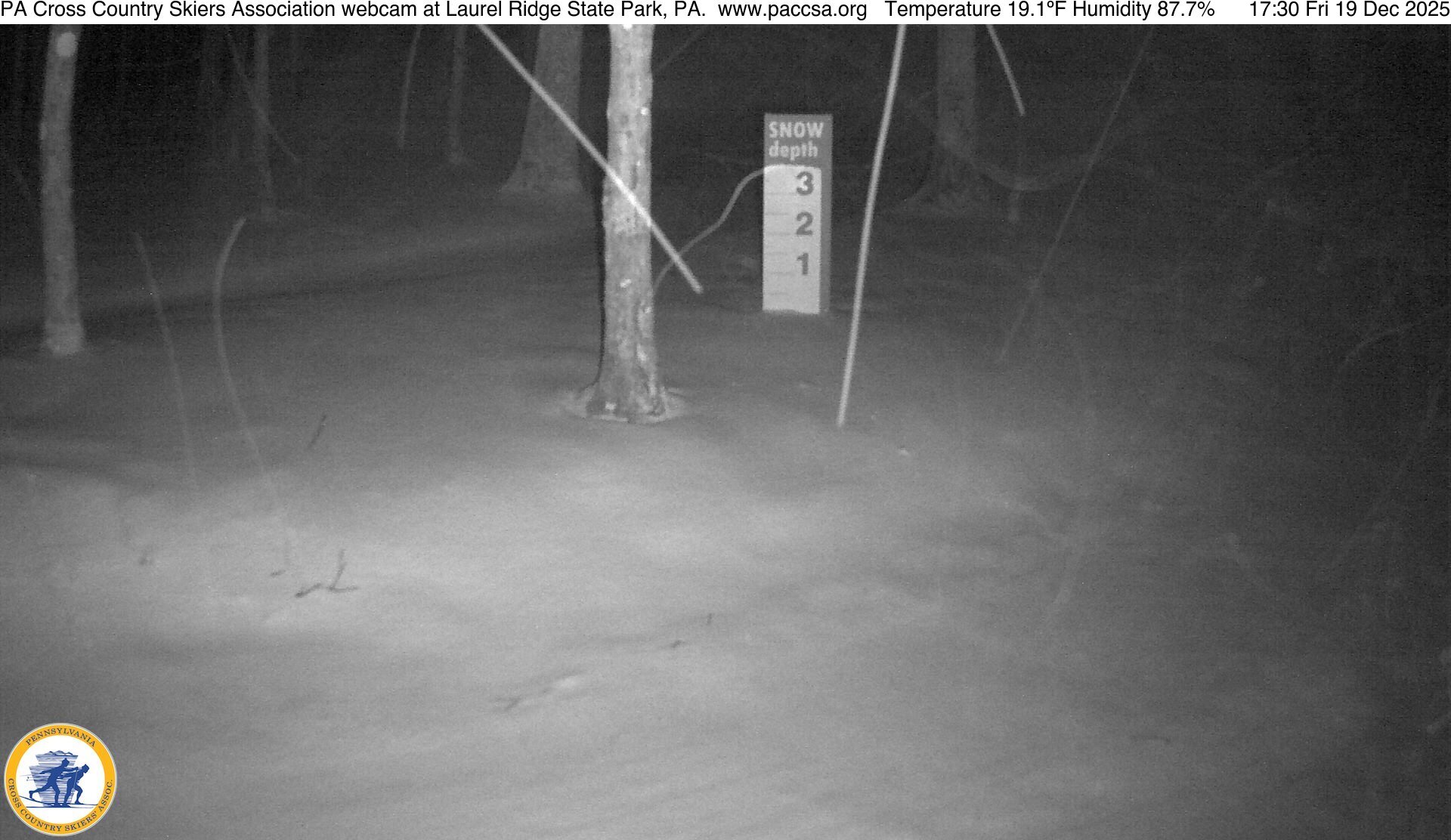 The webcam at Laurel Ridge State Park cross country ski area is owned and maintained by PACCSA, with the support of DCNR and donations from the public. Thank you to everyone who has contributed. The webcam operates from fall to spring, taking a photo of the ski area every half hour from sunrise to sunset. The ground elevation where it is sited is 852 m, 2795 ft.