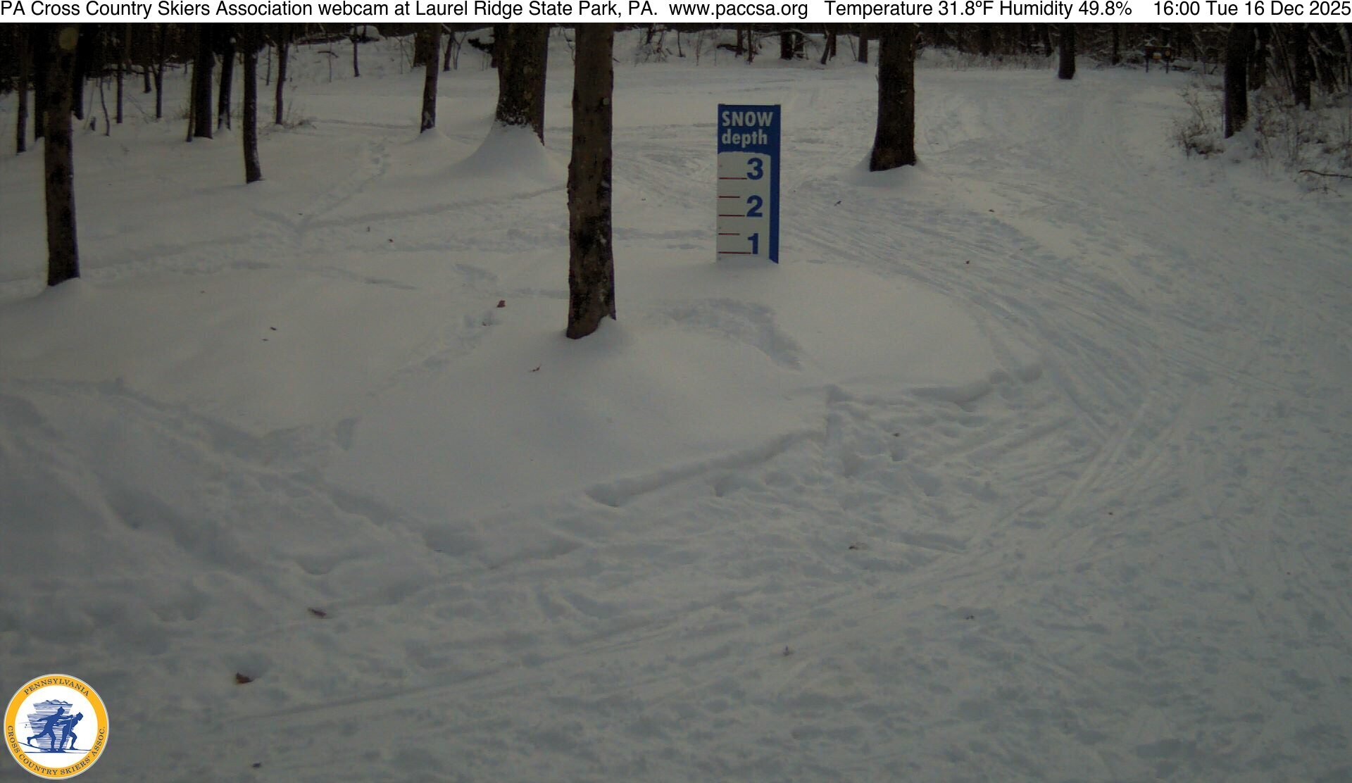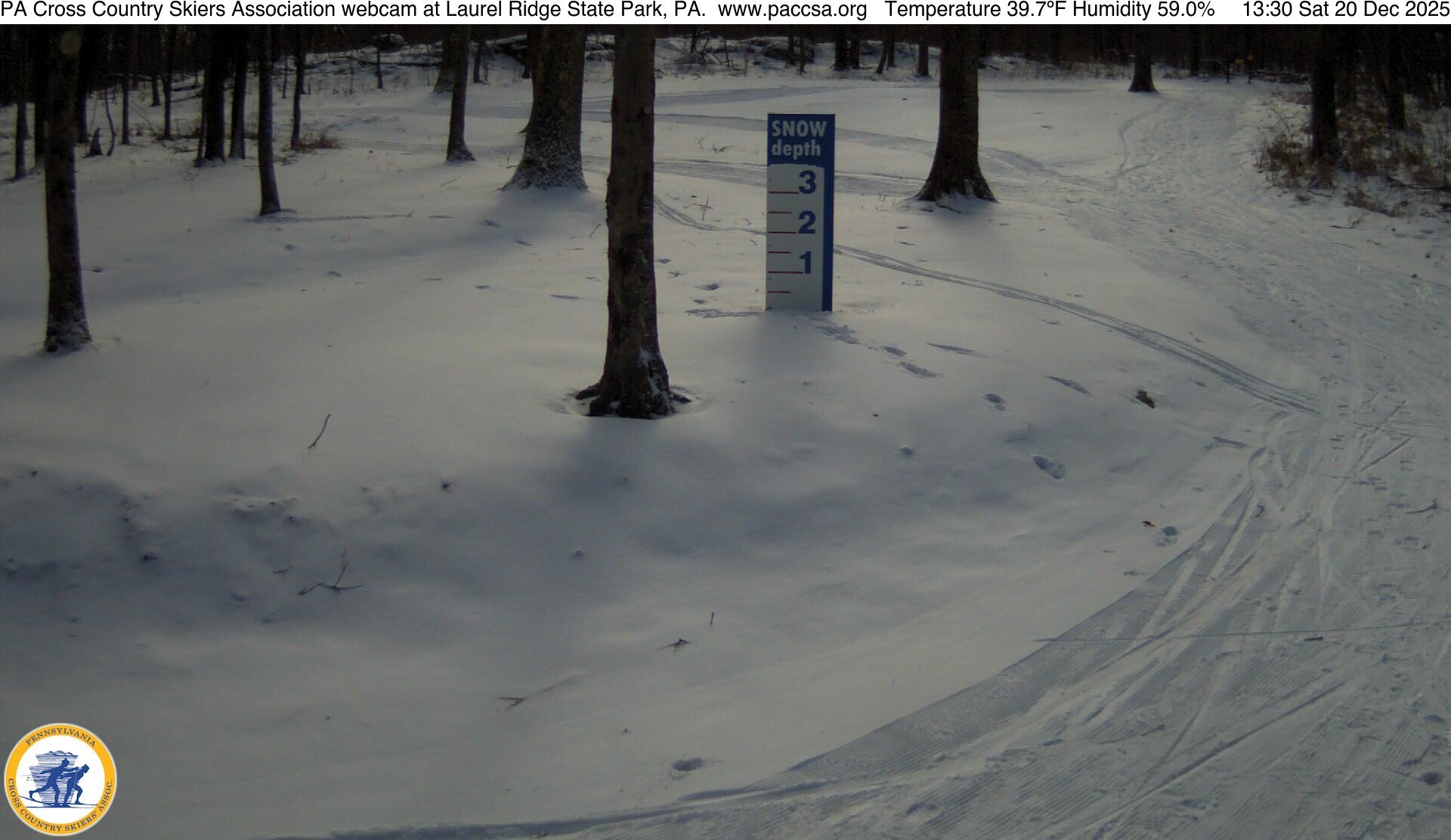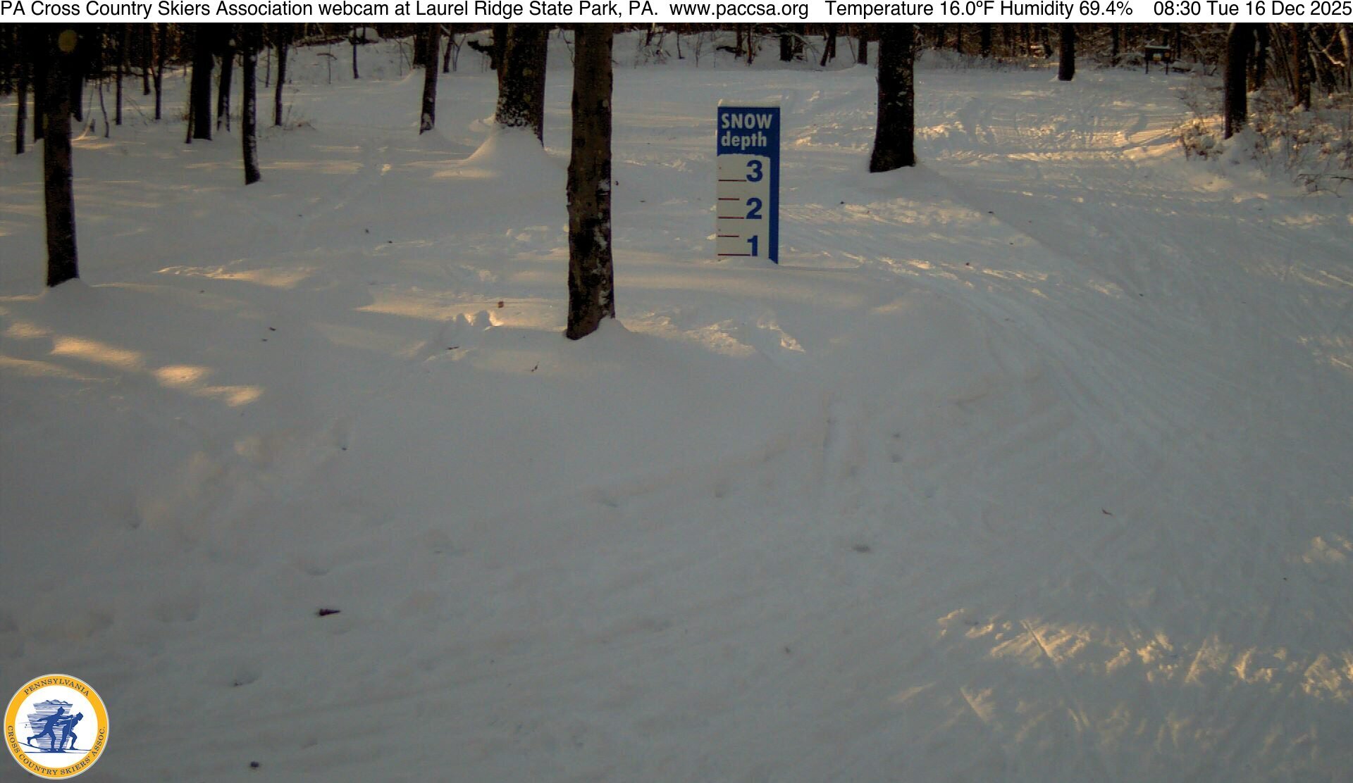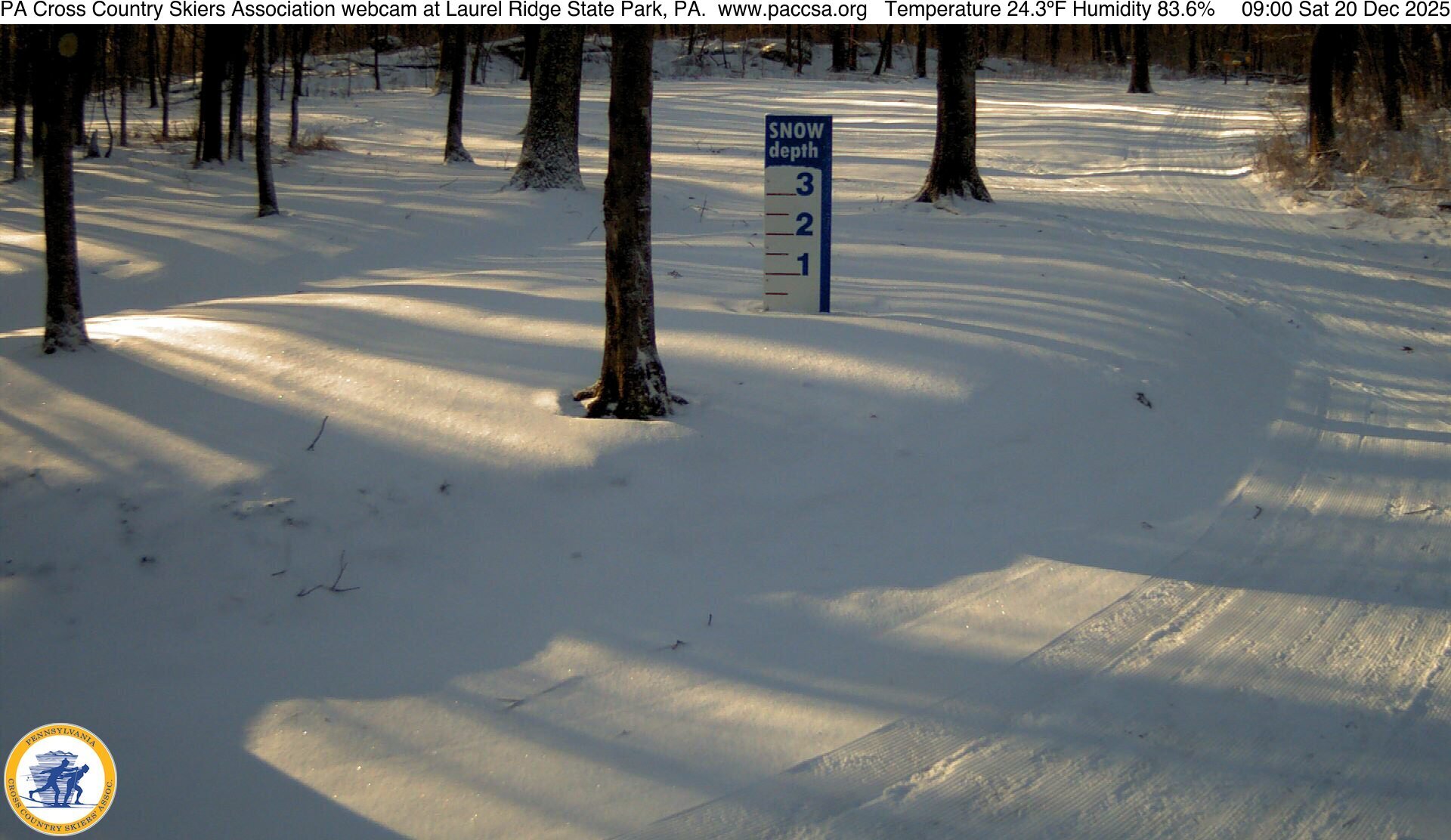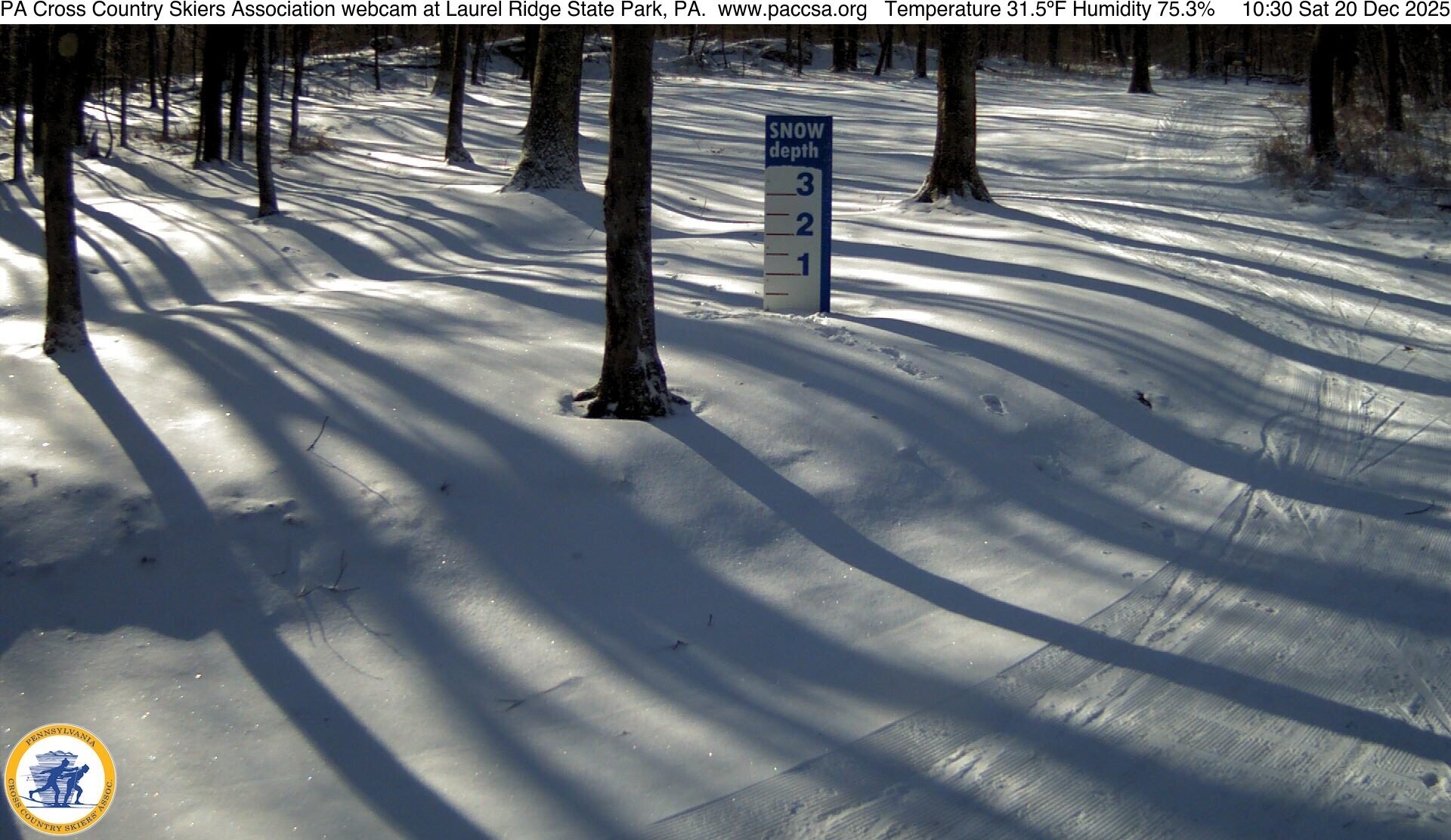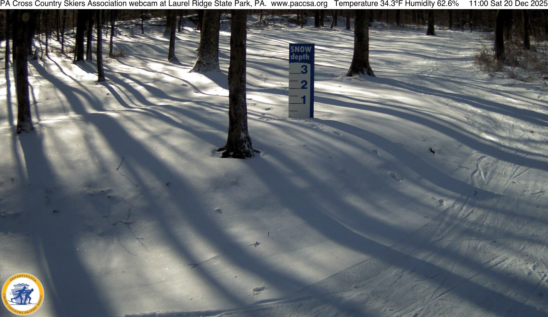The webcam at Laurel Ridge State Park cross country ski area is owned and maintained by PACCSA, with the support of DCNR and donations from the public. Thank you to everyone who has contributed. The webcam operates from fall to spring, taking a photo of the ski area every half hour from sunrise to sunset. The ground elevation where it is sited is 852 m, 2795 ft.