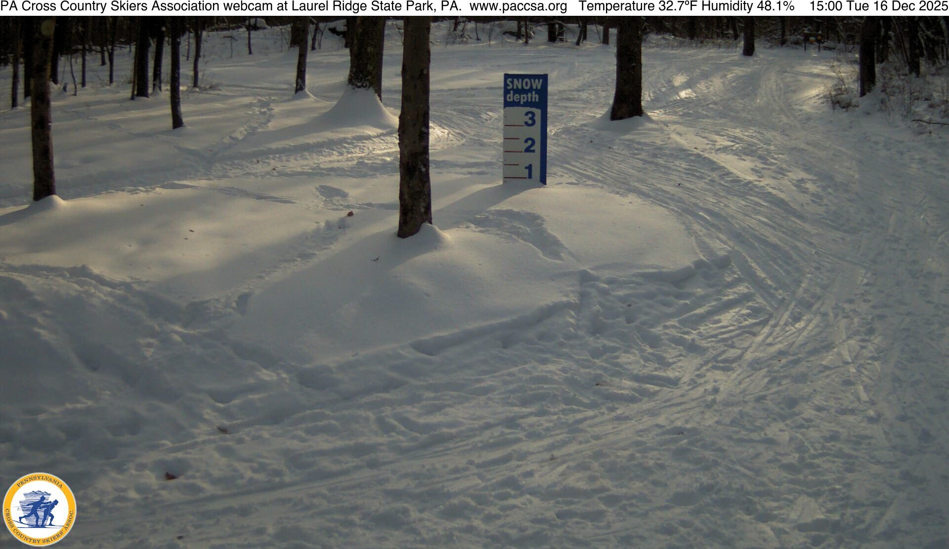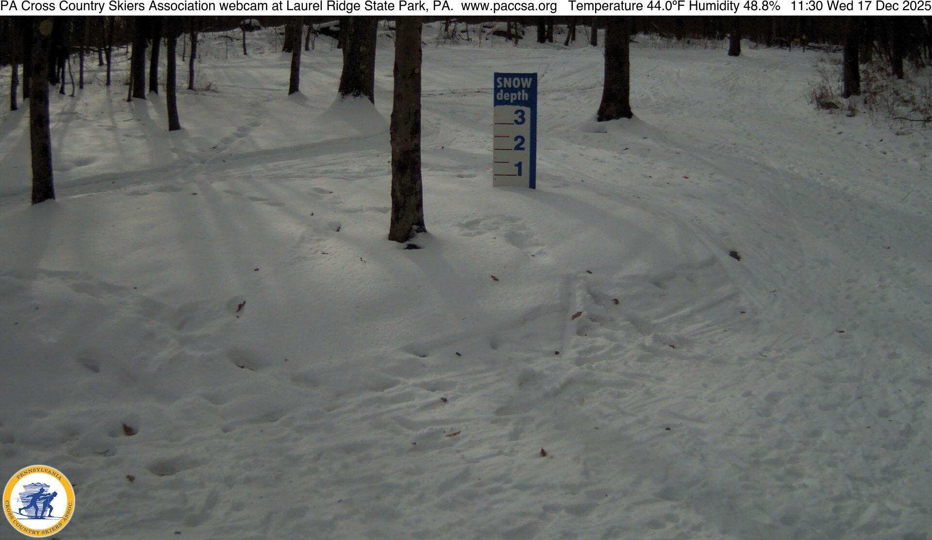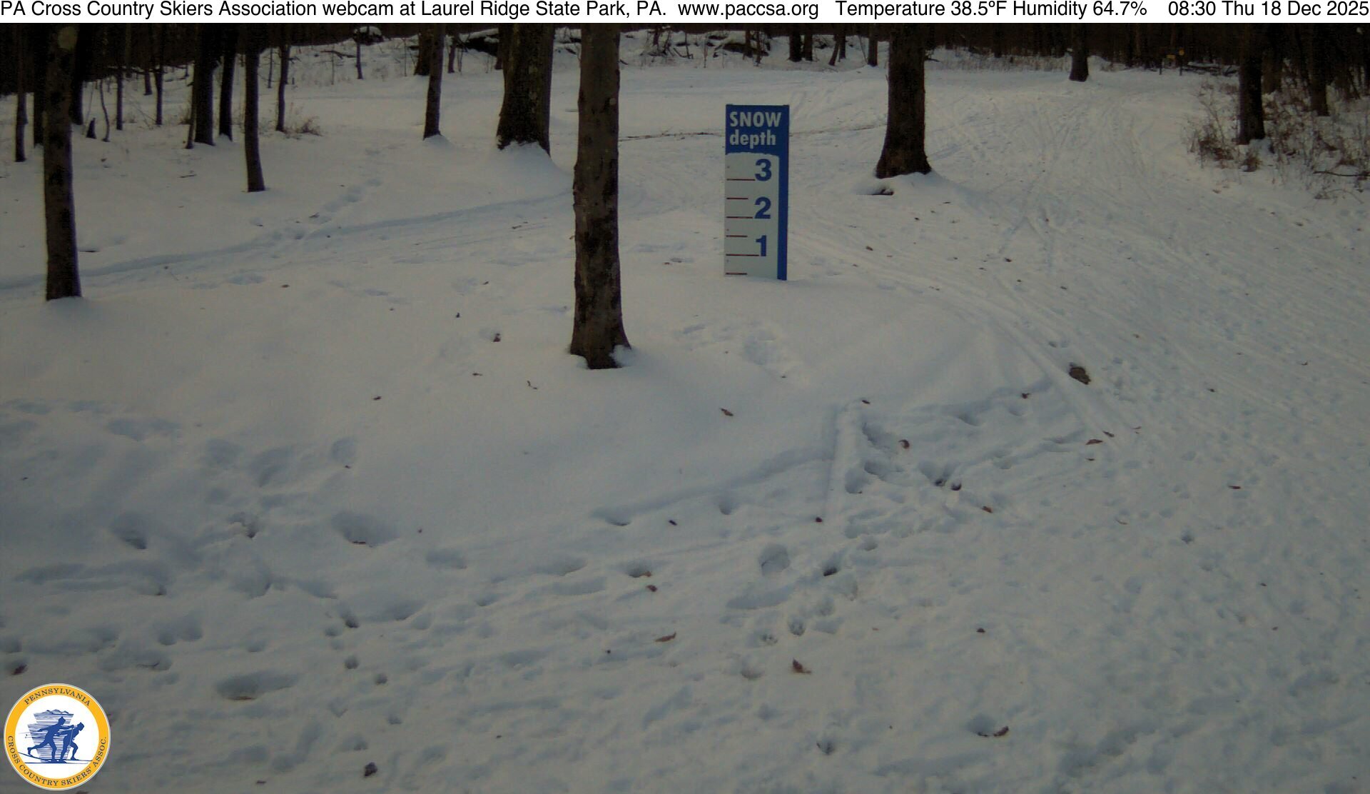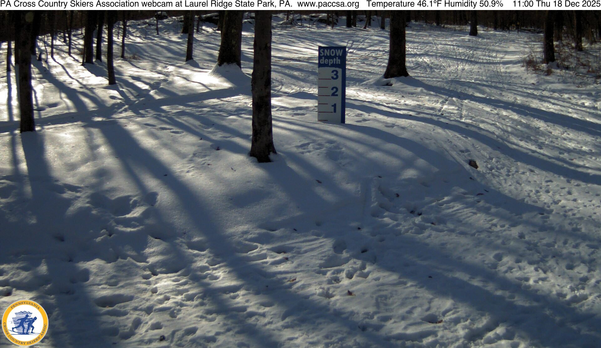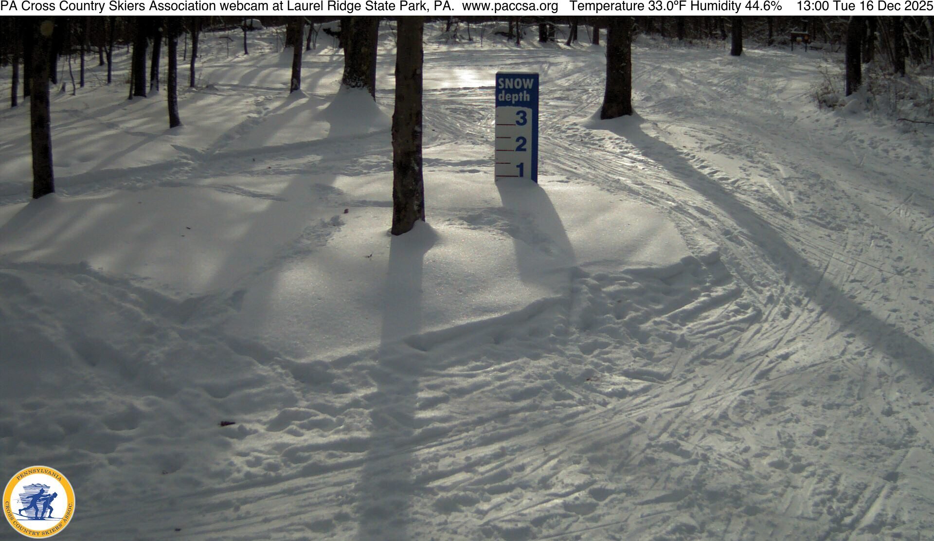 The webcam at Laurel Ridge State Park cross country ski area is owned and maintained by PACCSA, with the support of DCNR and donations from the public. Thank you to everyone who has contributed. The webcam operates from fall to spring, taking a photo of the ski area every half hour from sunrise to sunset. The ground elevation where it is sited is 852 m, 2795 ft.