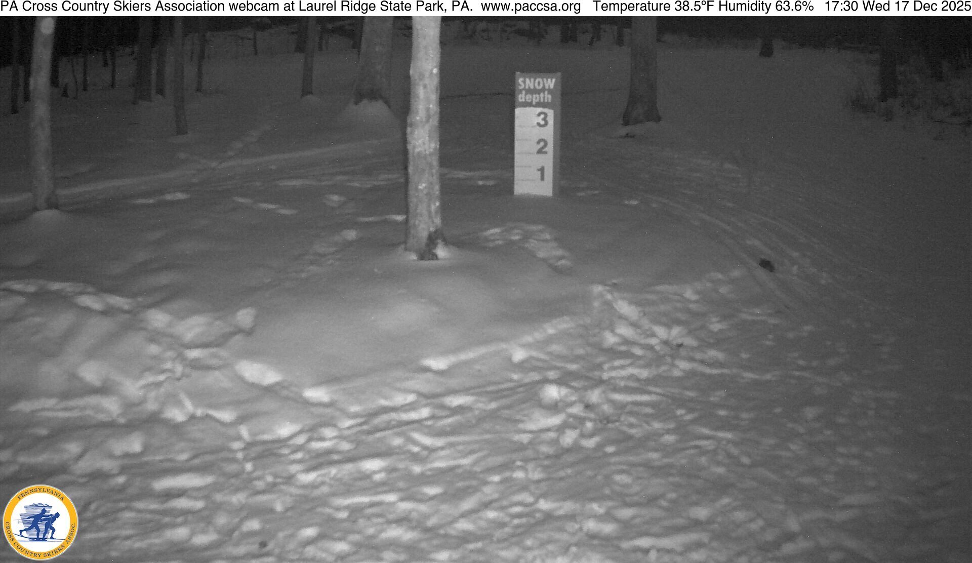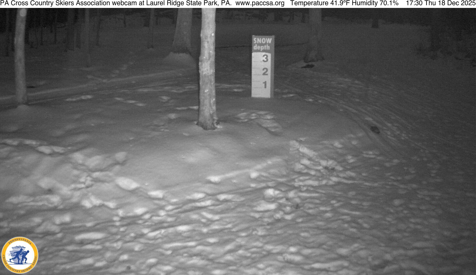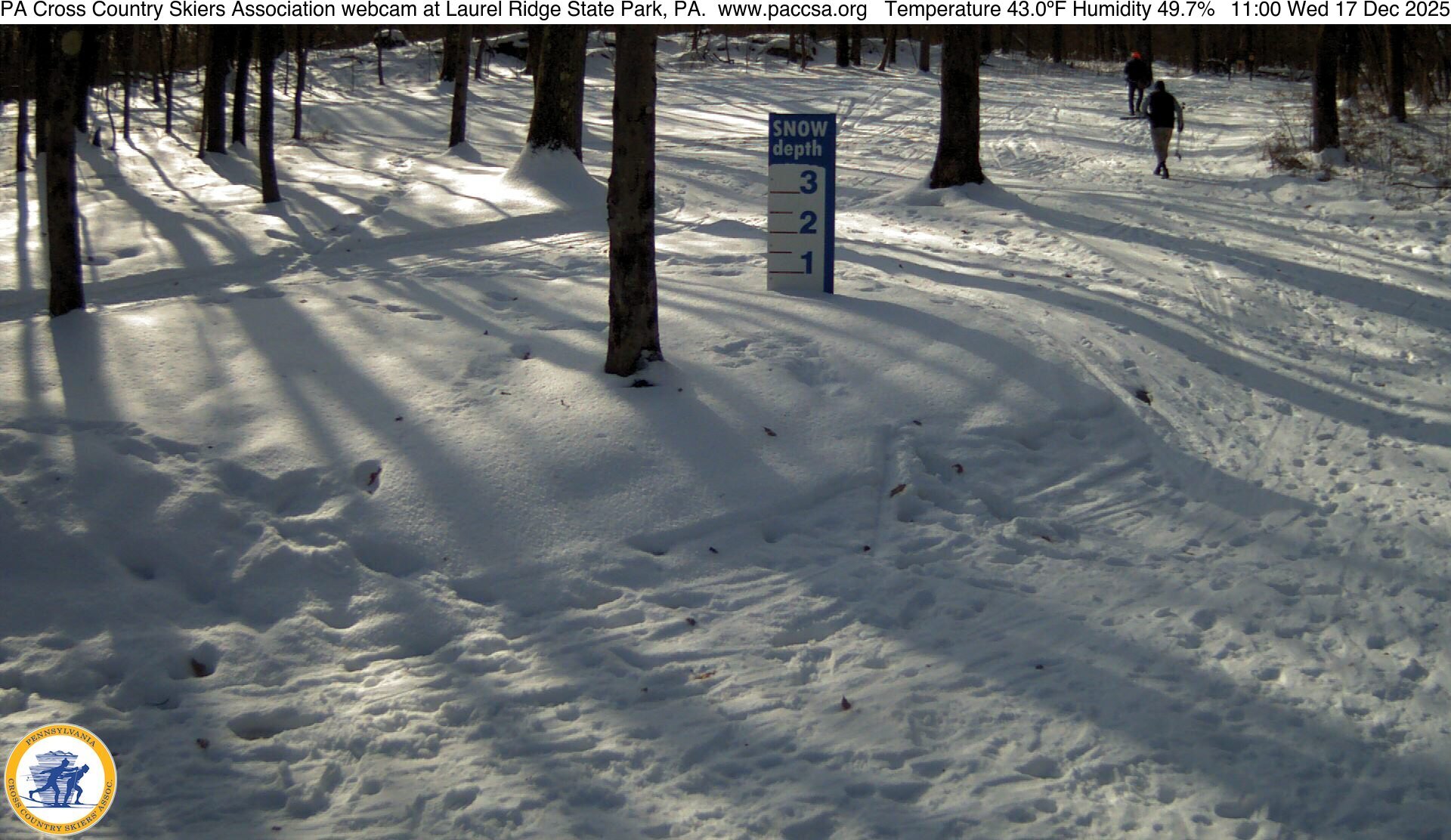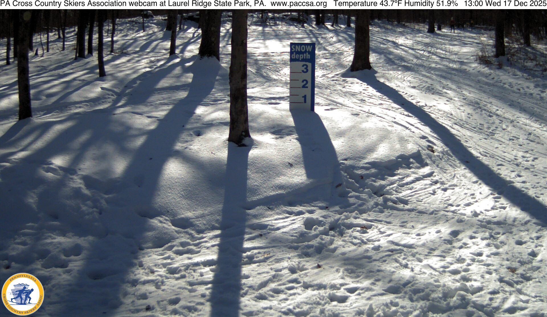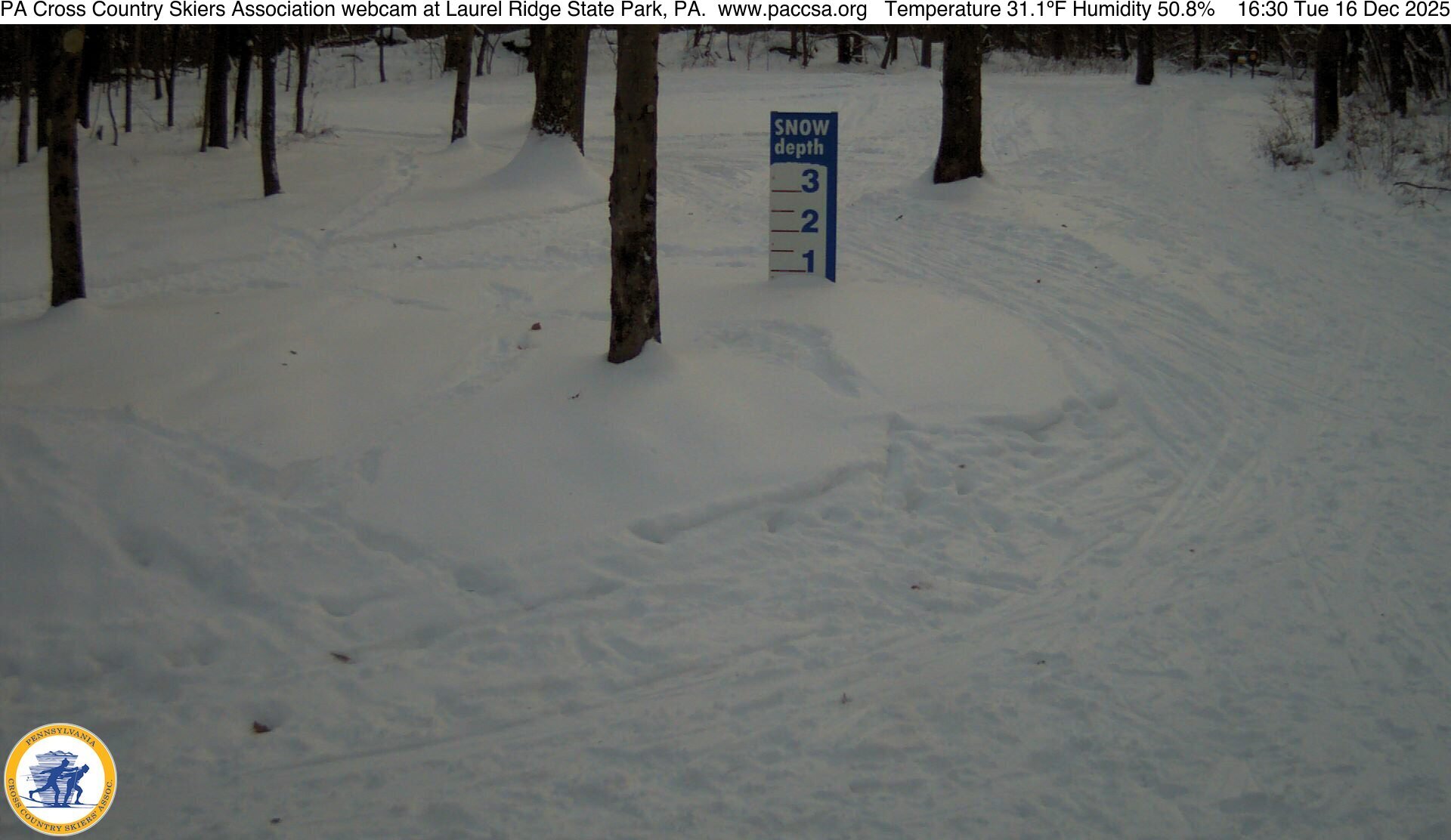 The webcam at Laurel Ridge State Park cross country ski area is owned and maintained by PACCSA, with the support of DCNR and donations from the public. Thank you to everyone who has contributed. The webcam operates from fall to spring, taking a photo of the ski area every half hour from sunrise to sunset. The ground elevation where it is sited is 852 m, 2795 ft.