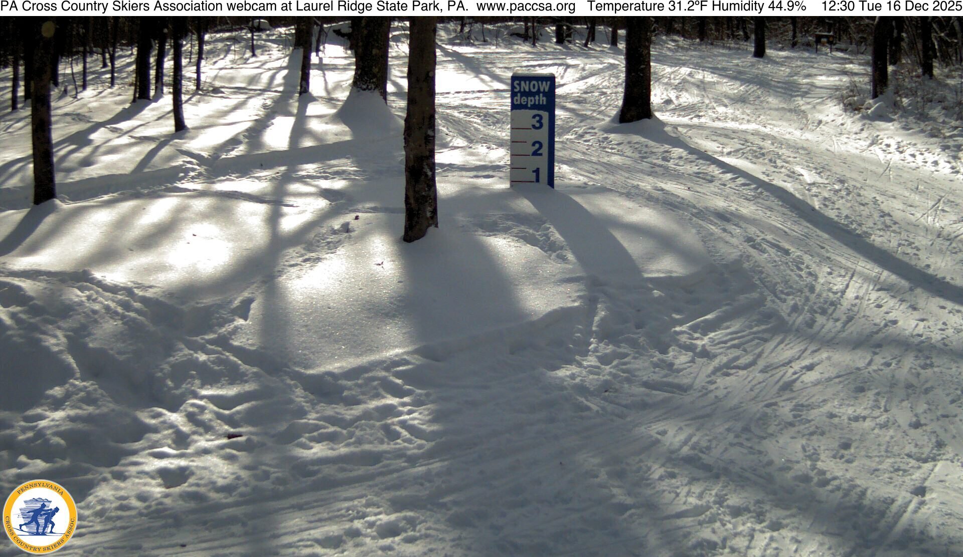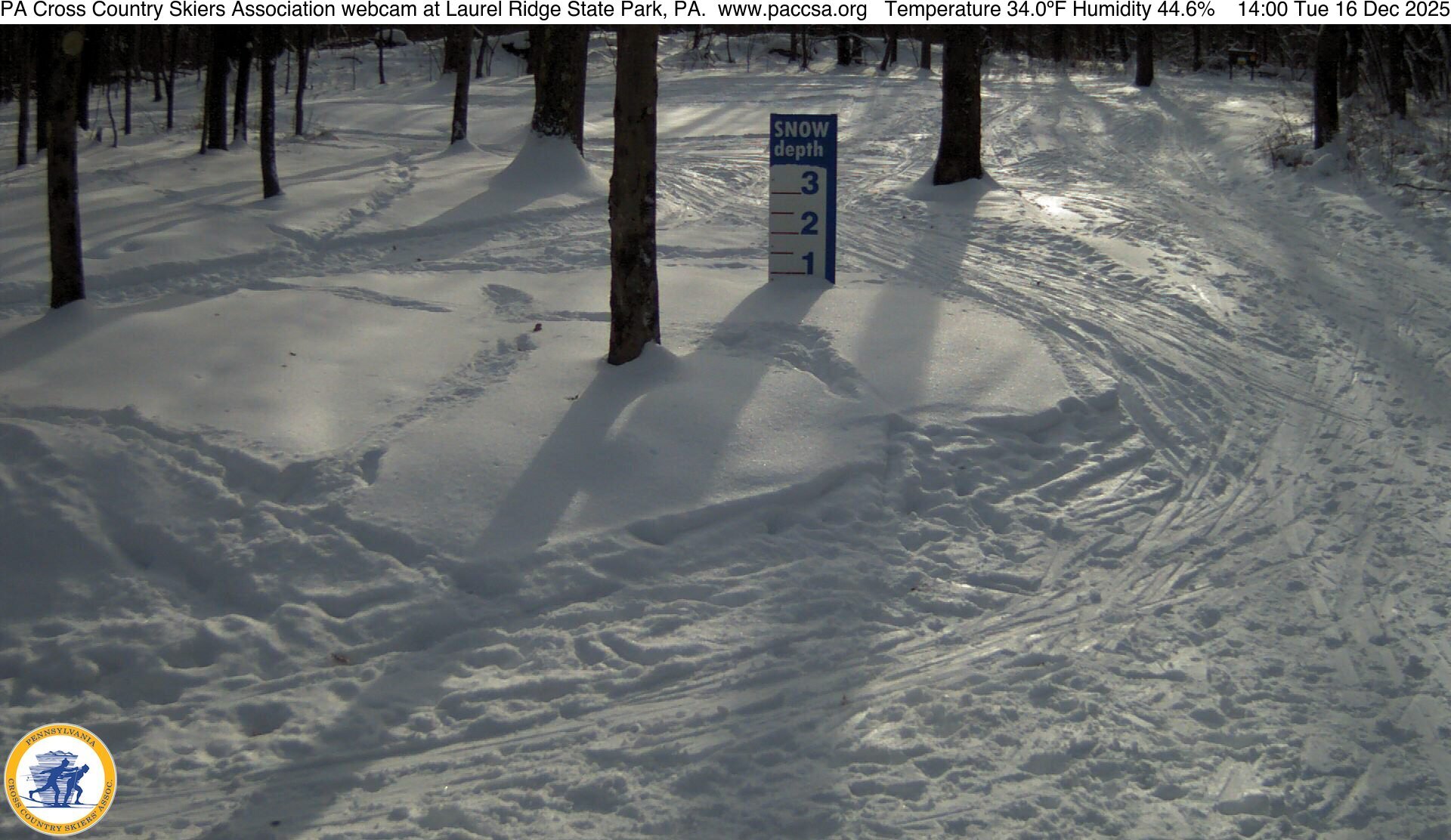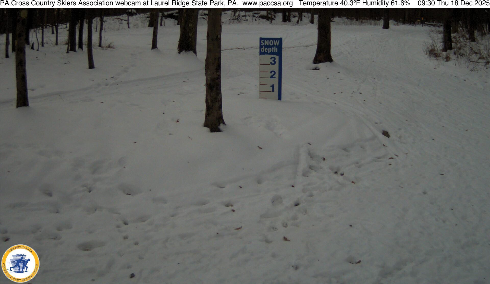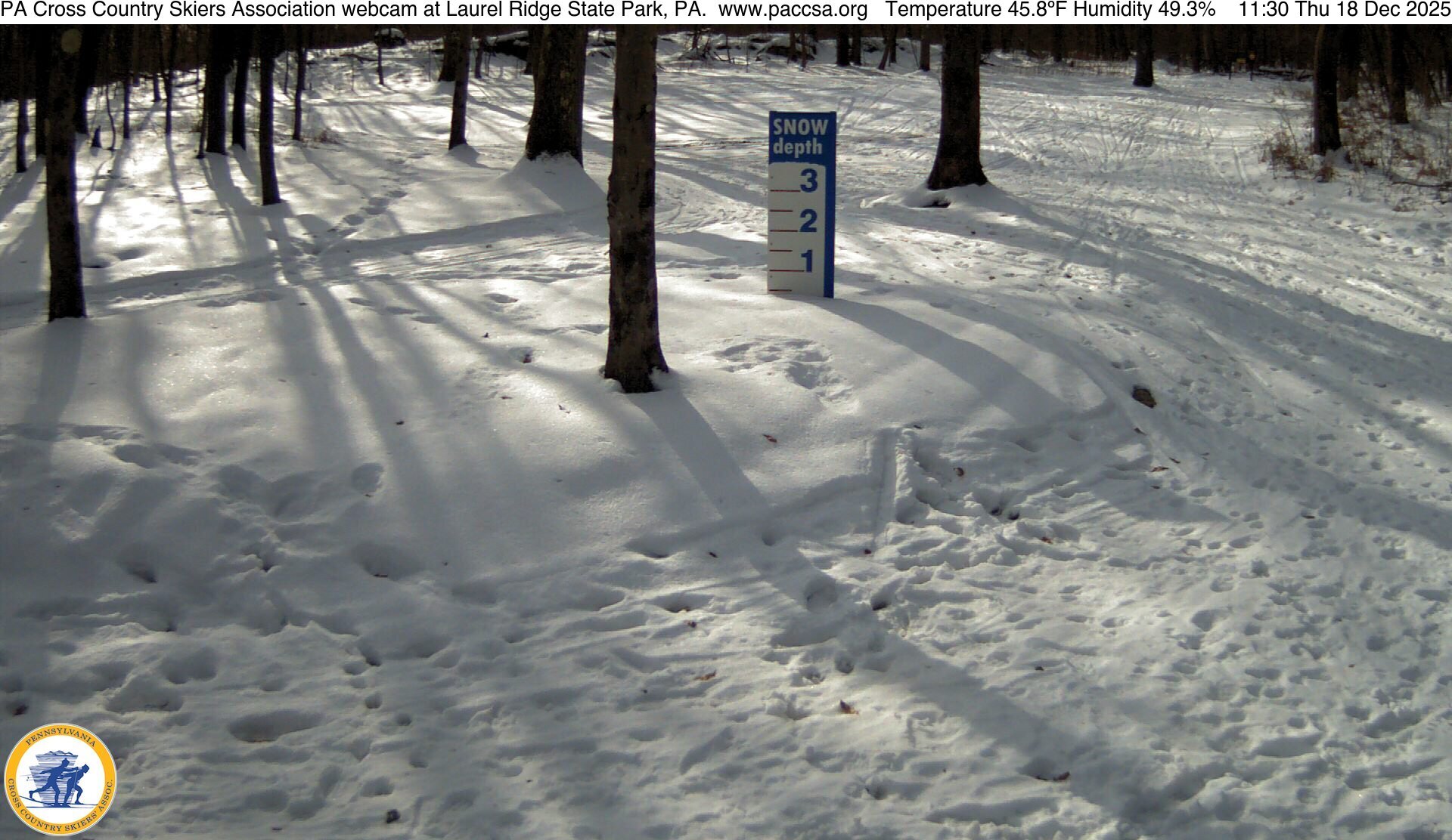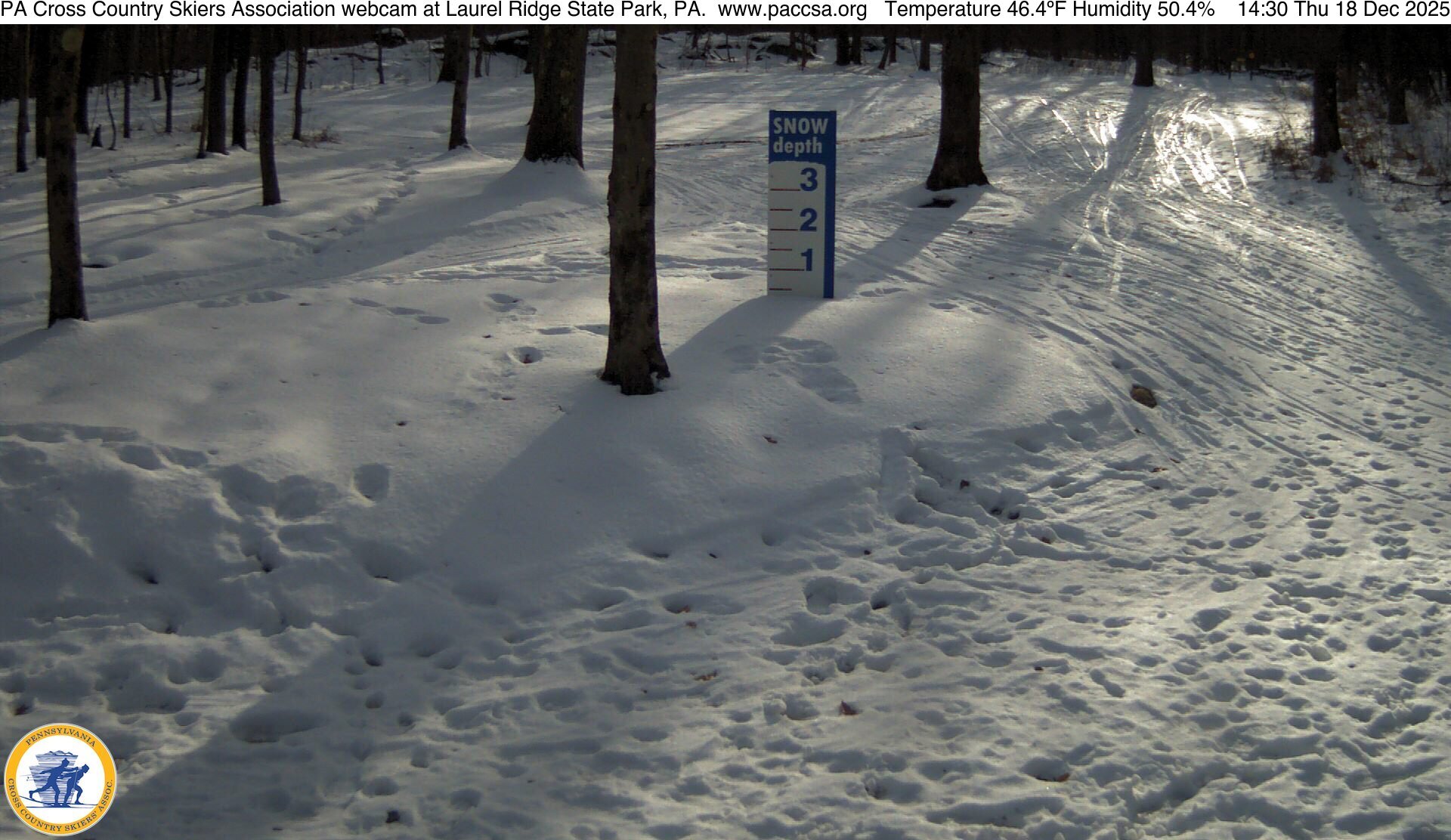 The webcam at Laurel Ridge State Park cross country ski area is owned and maintained by PACCSA, with the support of DCNR and donations from the public. Thank you to everyone who has contributed. The webcam operates from fall to spring, taking a photo of the ski area every half hour from sunrise to sunset. The ground elevation where it is sited is 852 m, 2795 ft.