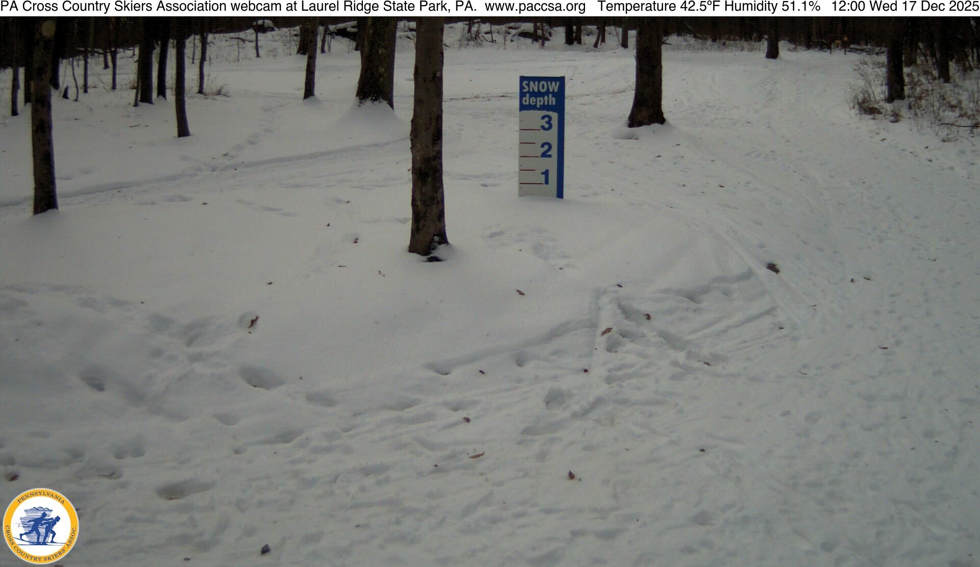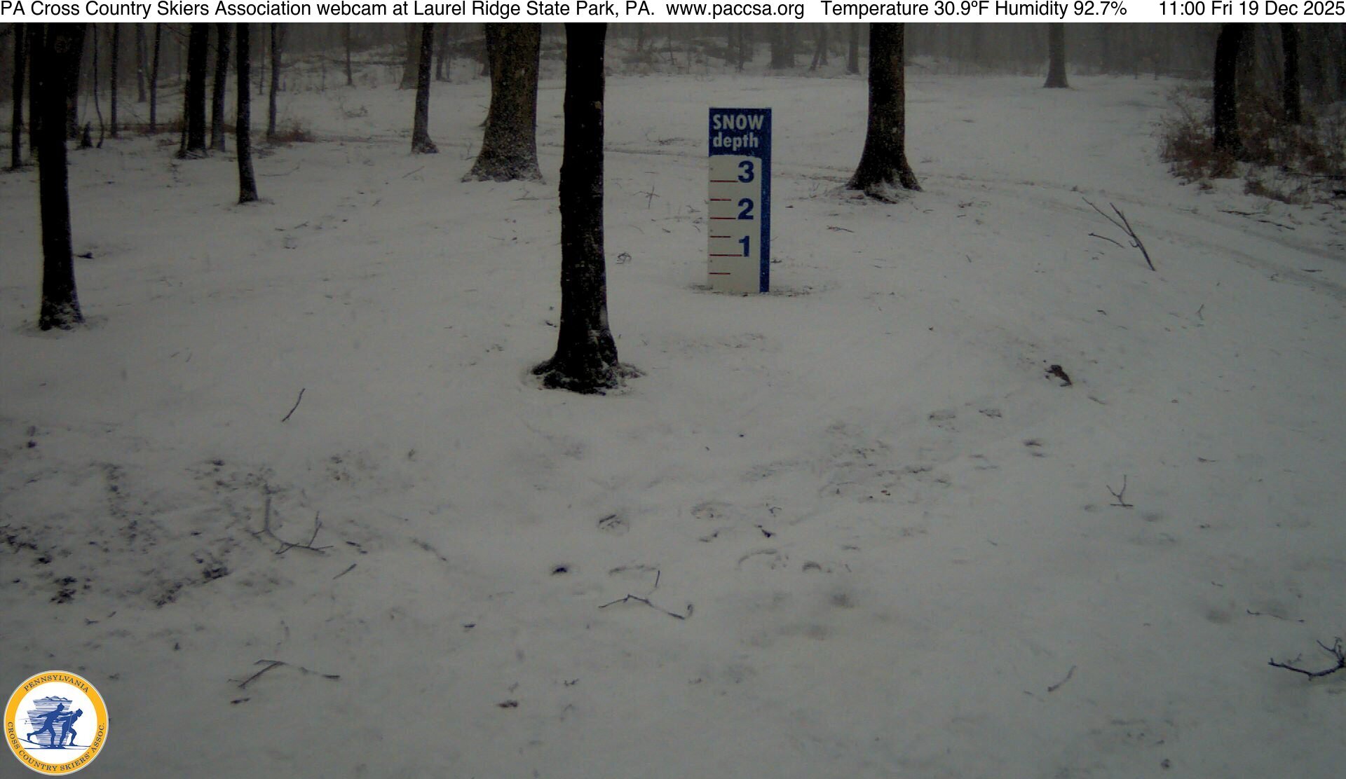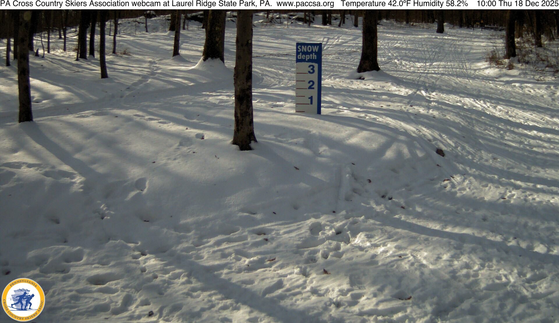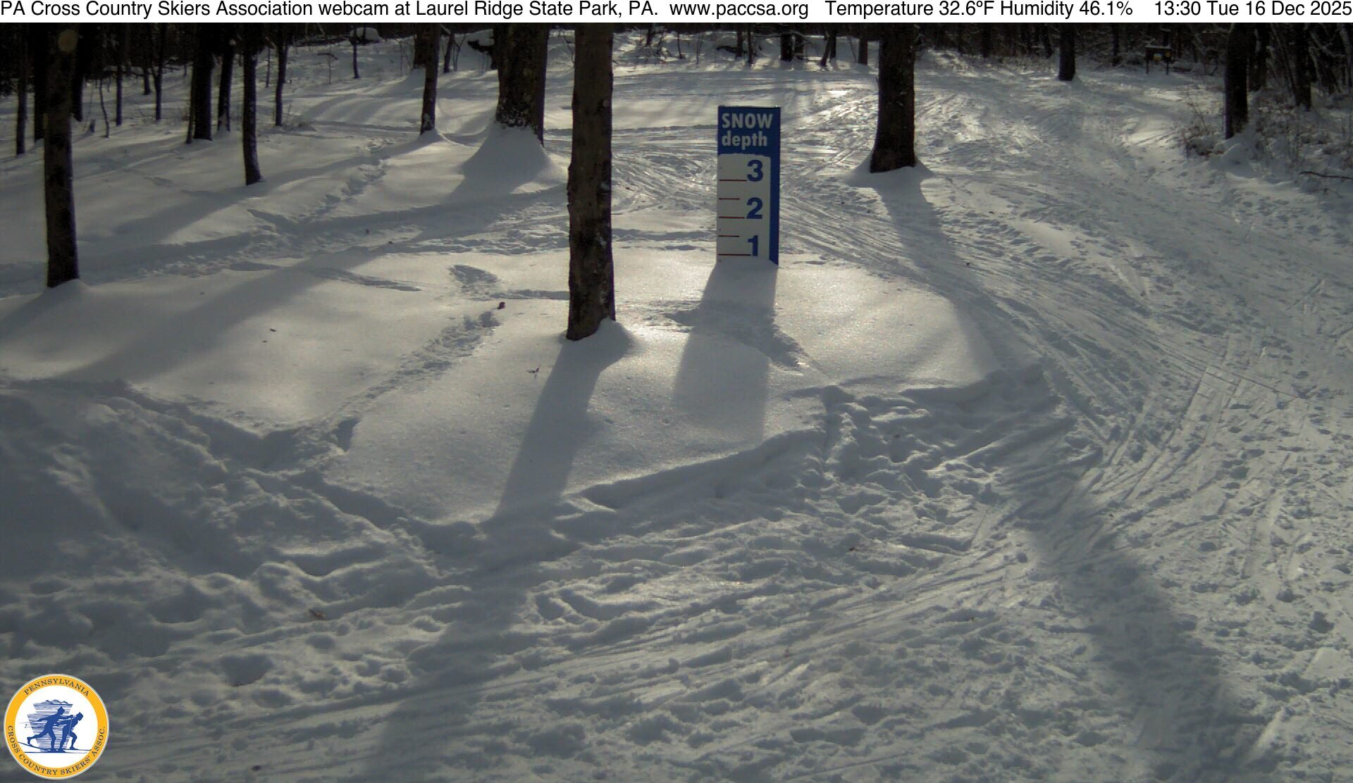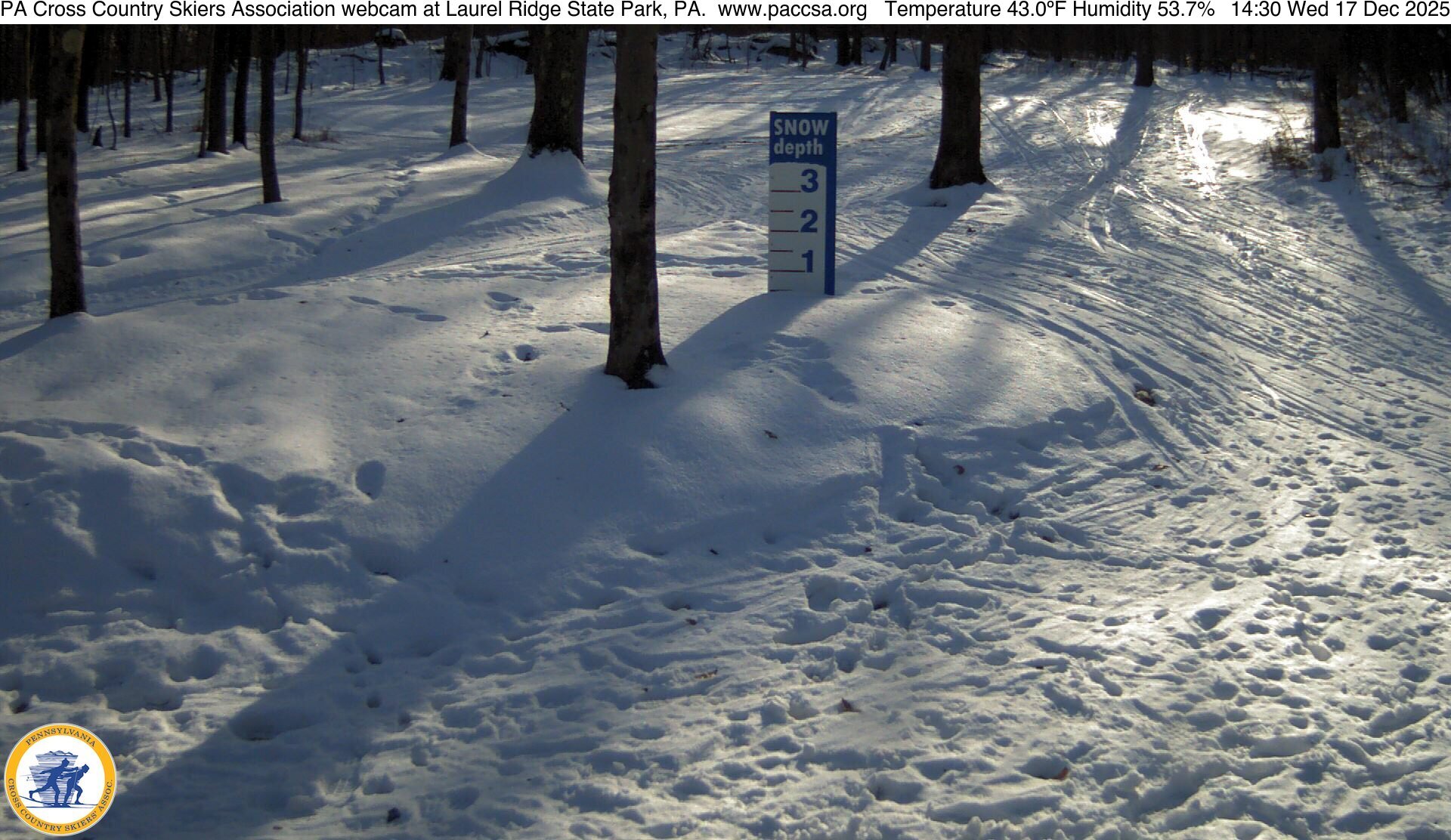 The webcam at Laurel Ridge State Park cross country ski area is owned and maintained by PACCSA, with the support of DCNR and donations from the public. Thank you to everyone who has contributed. The webcam operates from fall to spring, taking a photo of the ski area every half hour from sunrise to sunset. The ground elevation where it is sited is 852 m, 2795 ft.