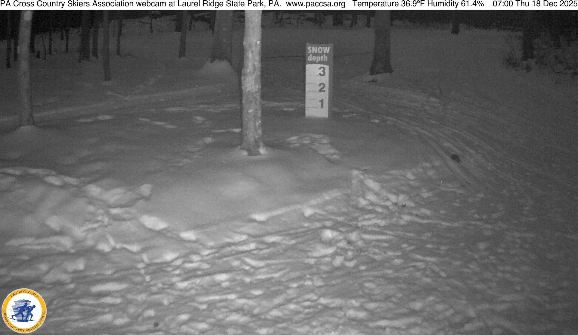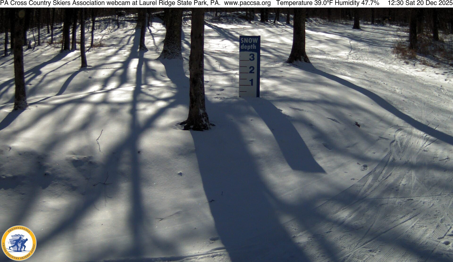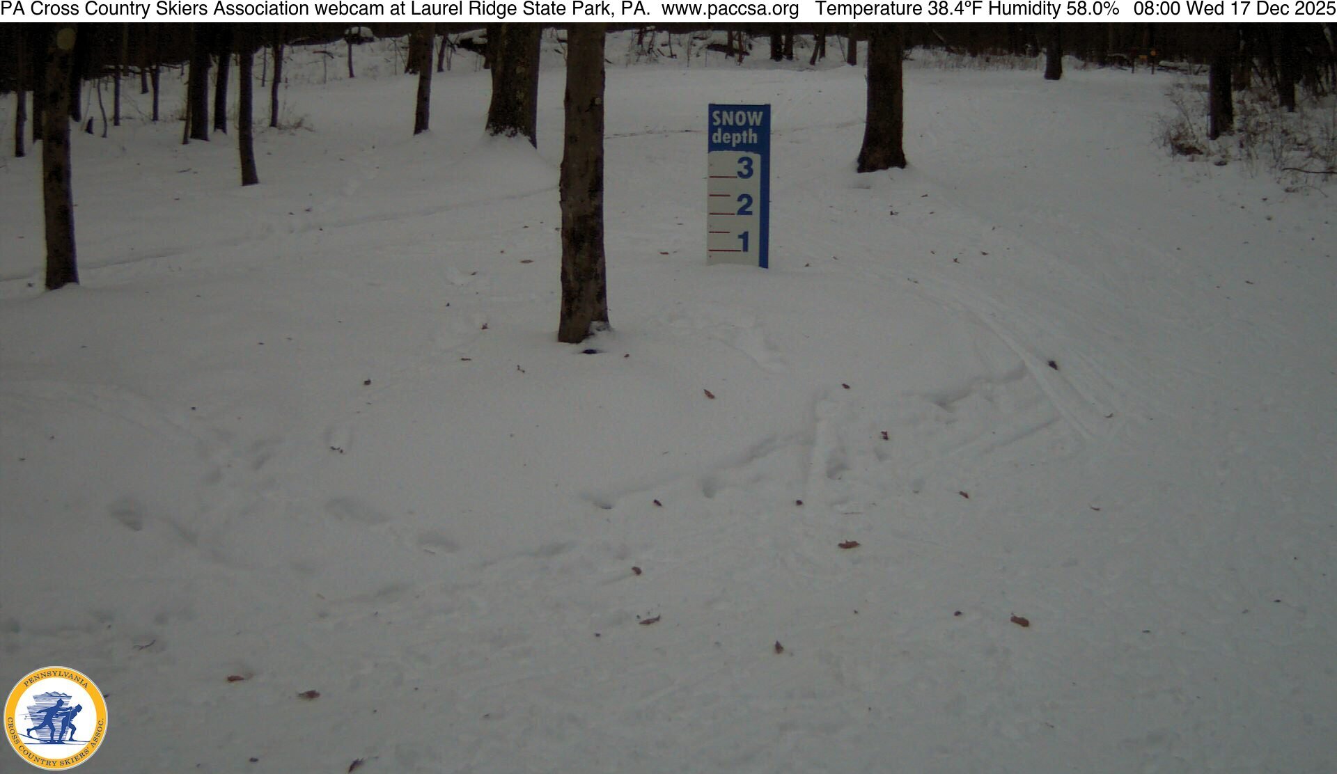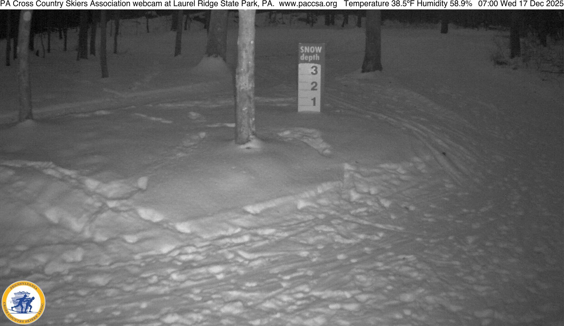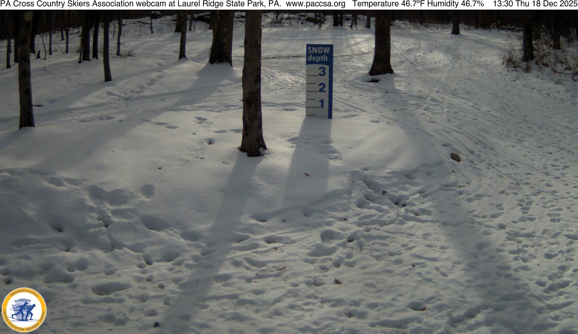 The webcam at Laurel Ridge State Park cross country ski area is owned and maintained by PACCSA, with the support of DCNR and donations from the public. Thank you to everyone who has contributed. The webcam operates from fall to spring, taking a photo of the ski area every half hour from sunrise to sunset. The ground elevation where it is sited is 852 m, 2795 ft.