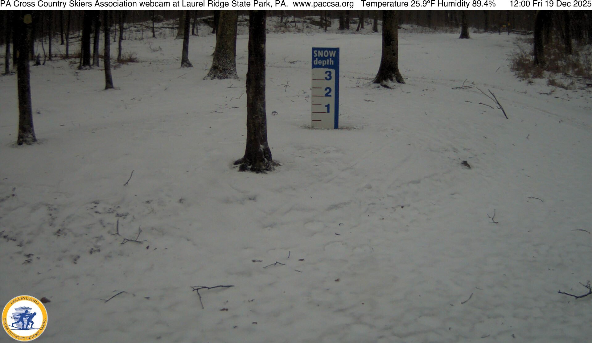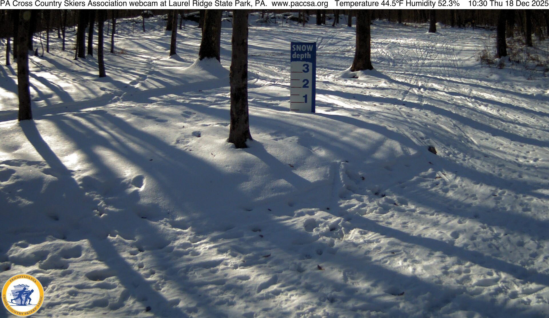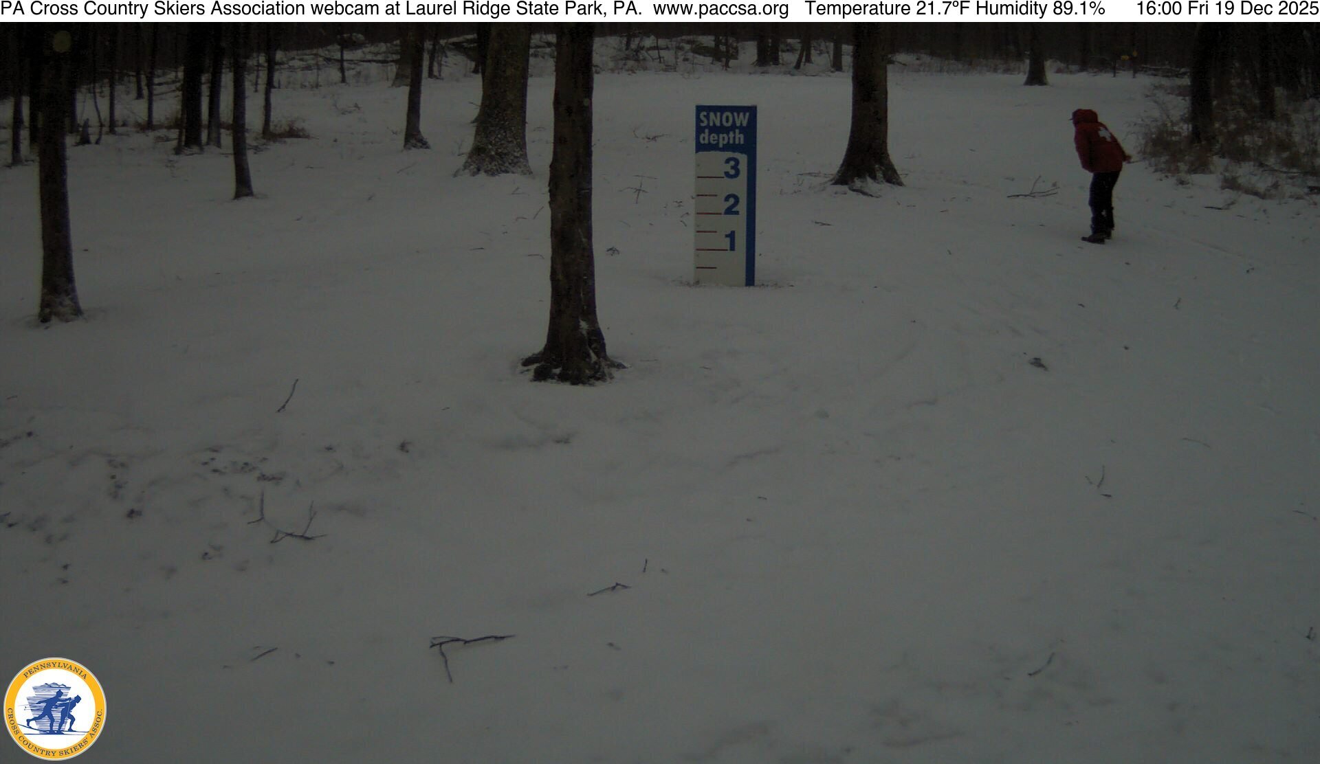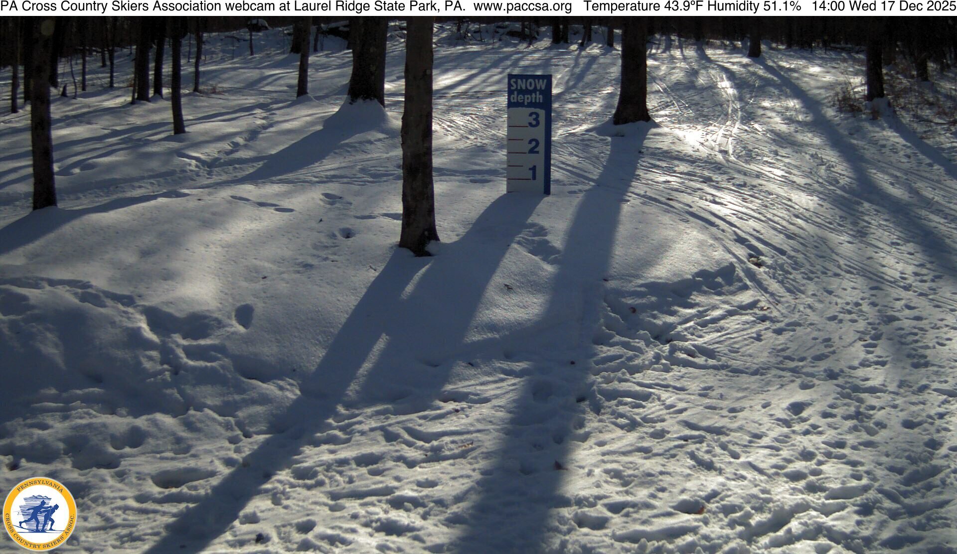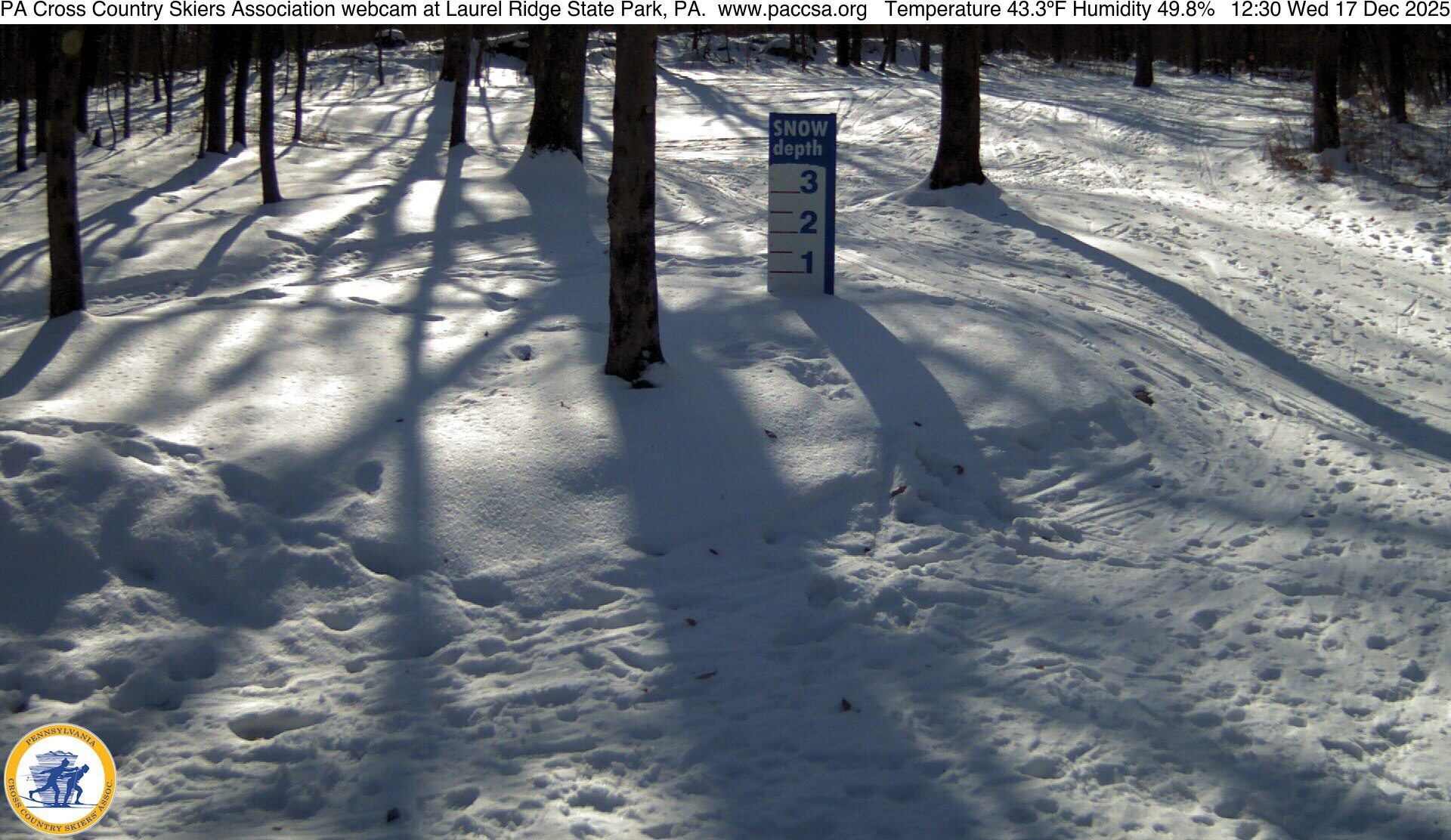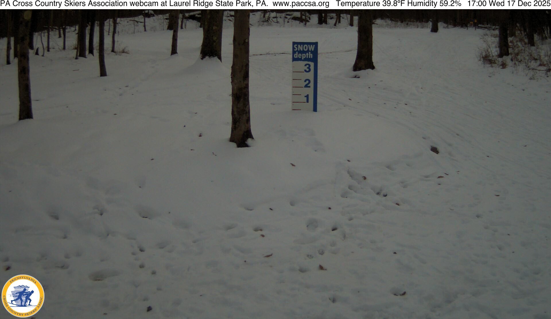 The webcam at Laurel Ridge State Park cross country ski area is owned and maintained by PACCSA, with the support of DCNR and donations from the public. Thank you to everyone who has contributed. The webcam operates from fall to spring, taking a photo of the ski area every half hour from sunrise to sunset. The ground elevation where it is sited is 852 m, 2795 ft.
