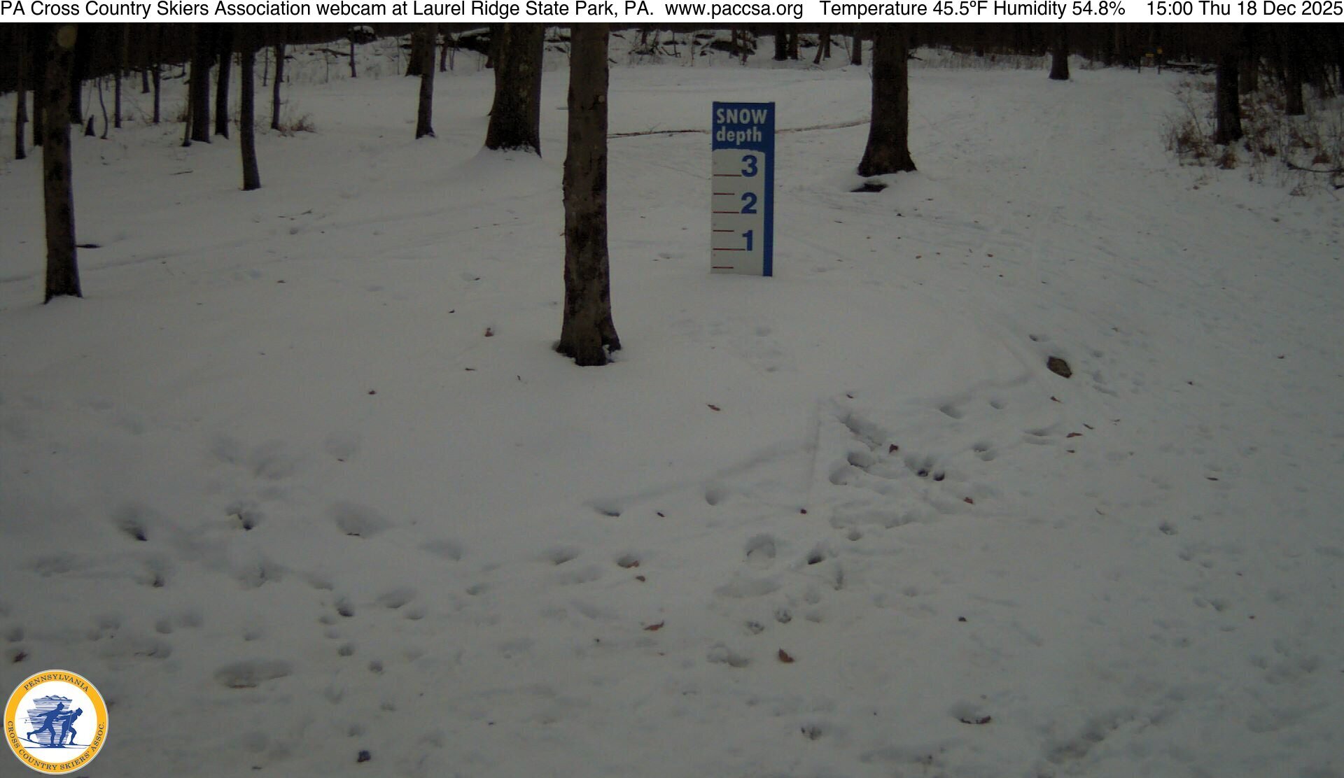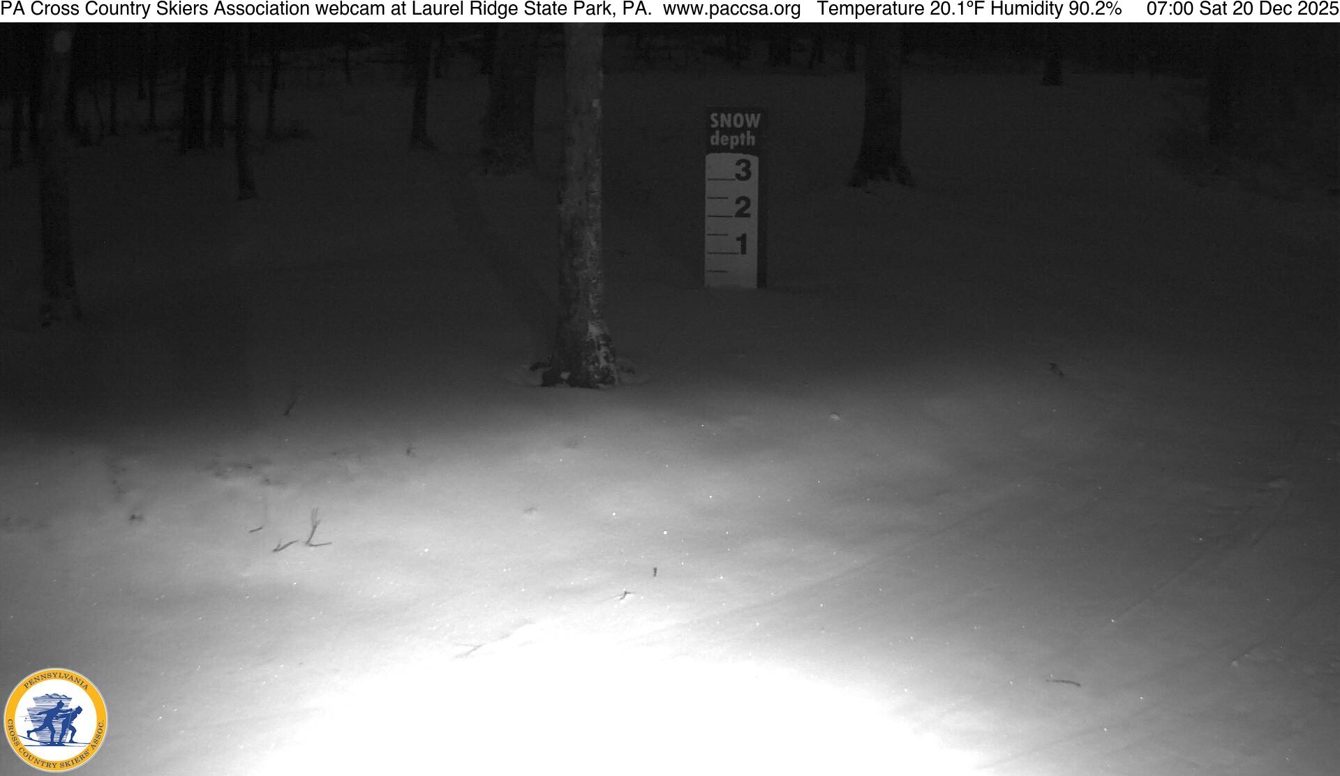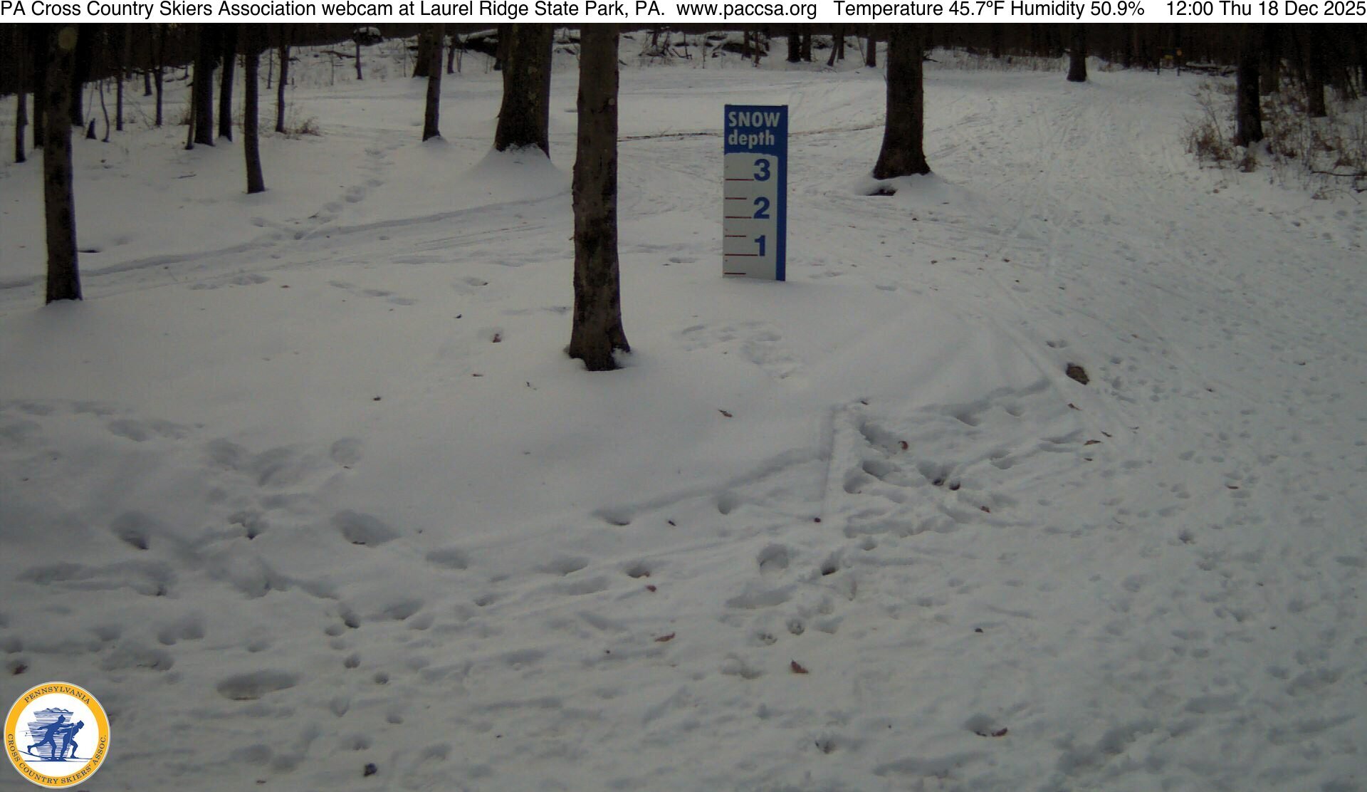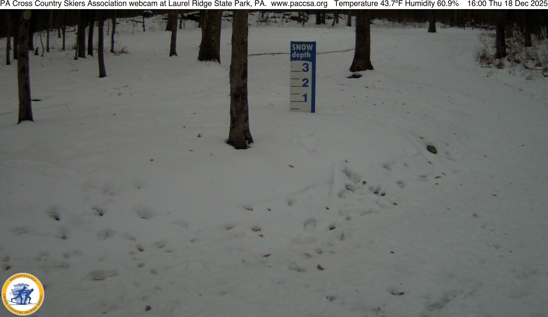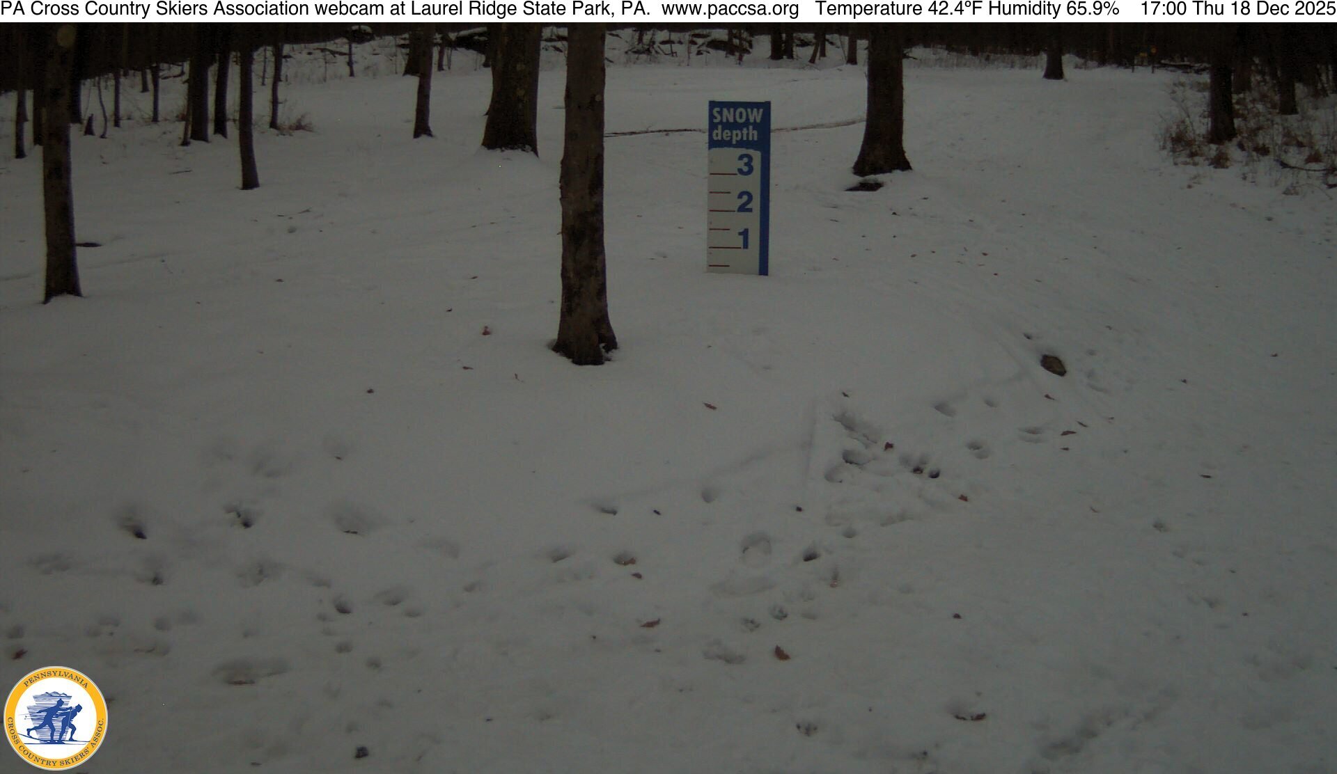 The webcam at Laurel Ridge State Park cross country ski area is owned and maintained by PACCSA, with the support of DCNR and donations from the public. Thank you to everyone who has contributed. The webcam operates from fall to spring, taking a photo of the ski area every half hour from sunrise to sunset. The ground elevation where it is sited is 852 m, 2795 ft.