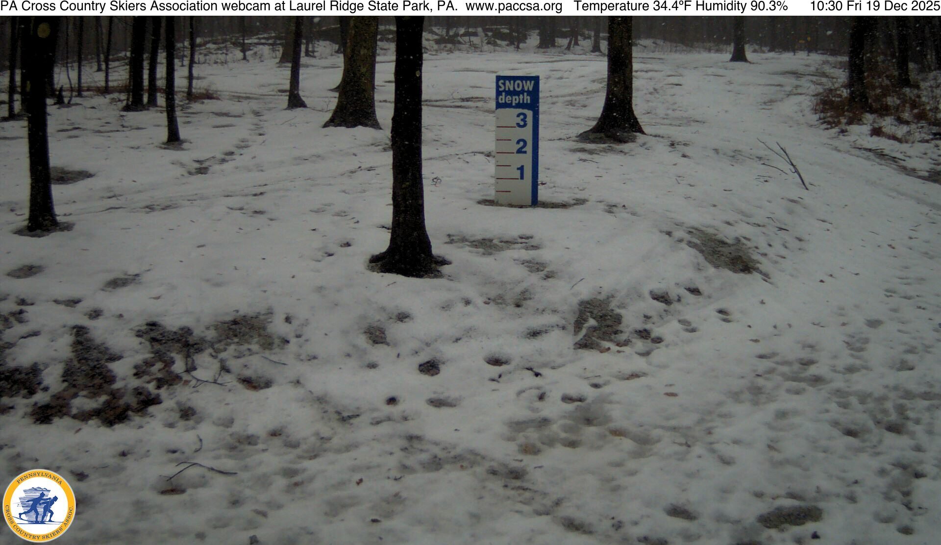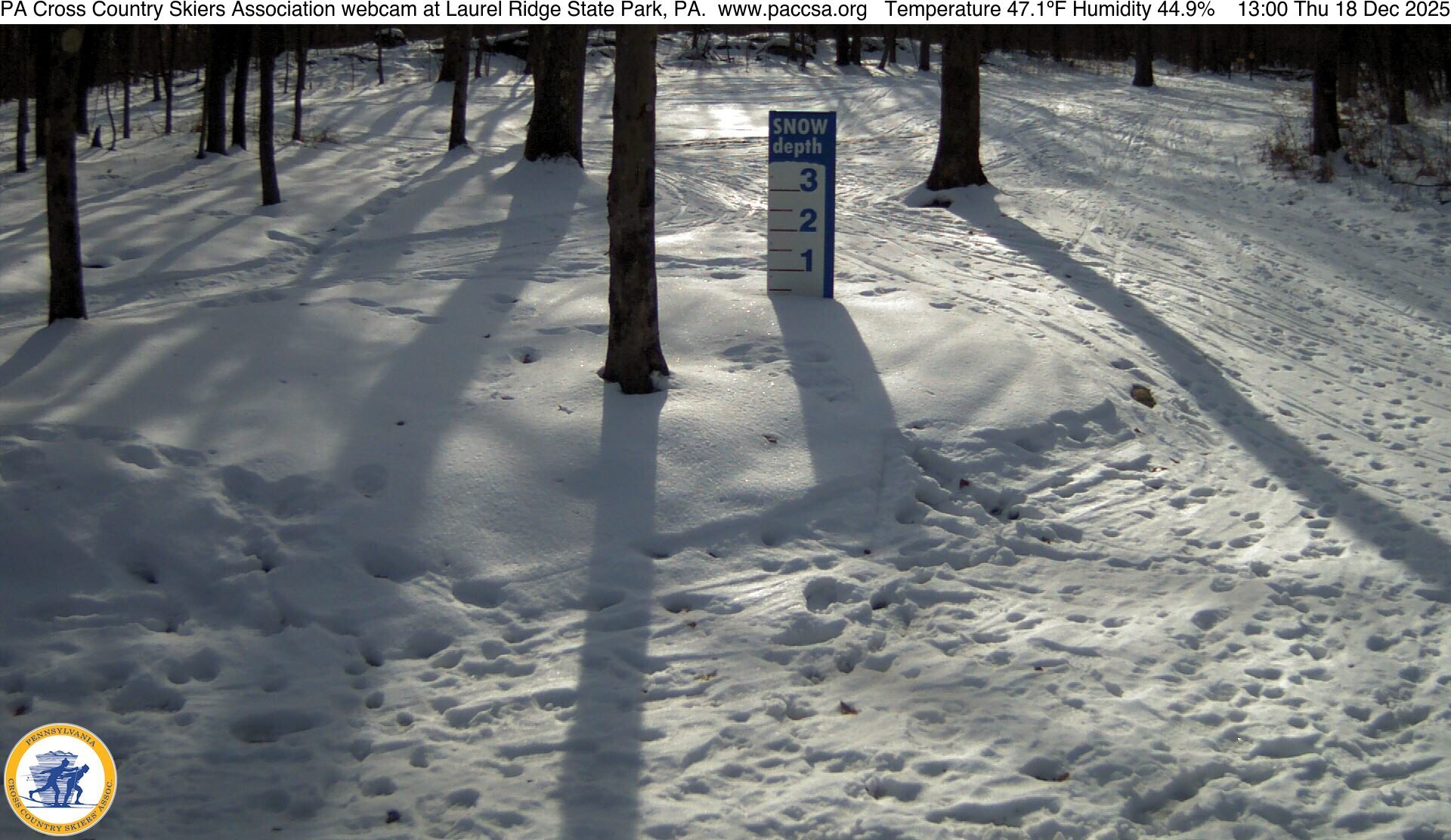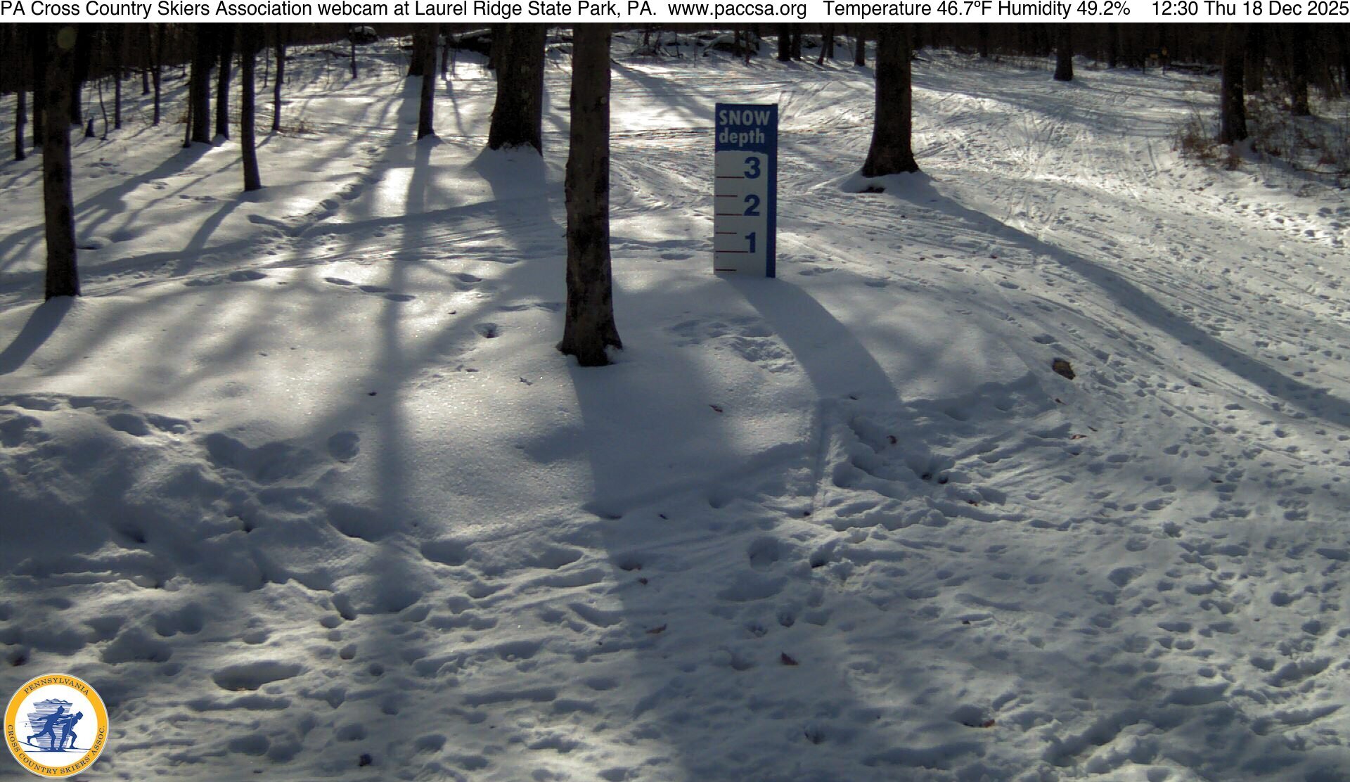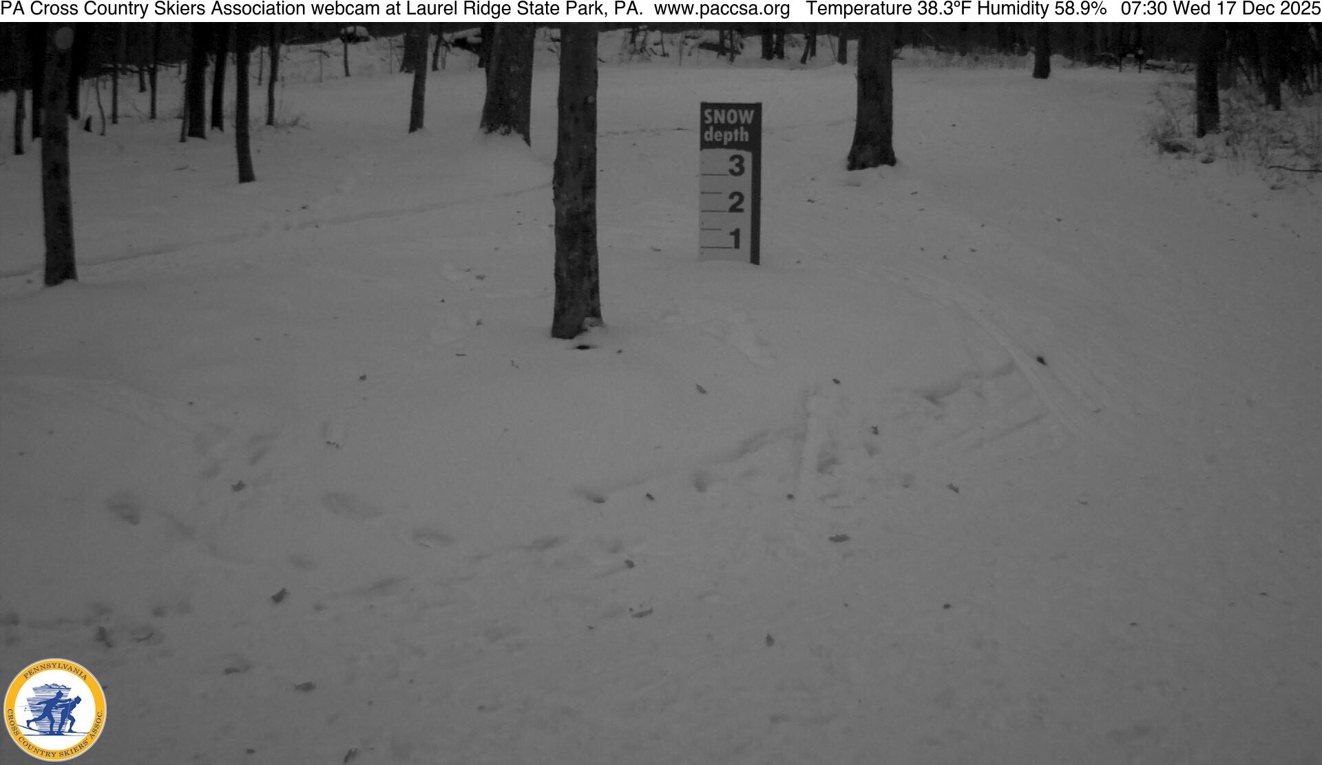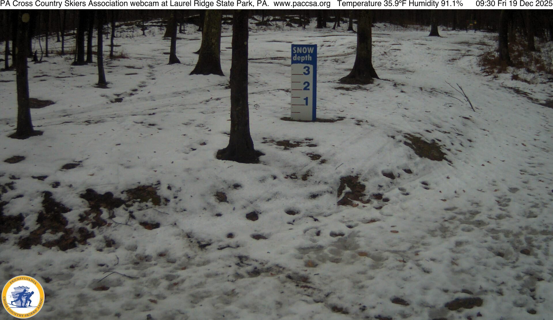 The webcam at Laurel Ridge State Park cross country ski area is owned and maintained by PACCSA, with the support of DCNR and donations from the public. Thank you to everyone who has contributed. The webcam operates from fall to spring, taking a photo of the ski area every half hour from sunrise to sunset. The ground elevation where it is sited is 852 m, 2795 ft.