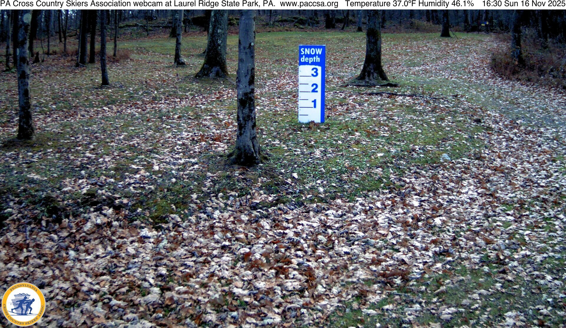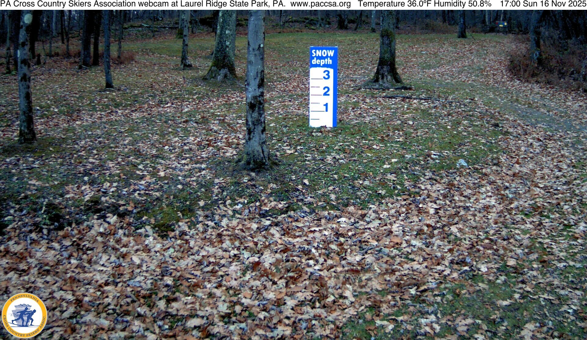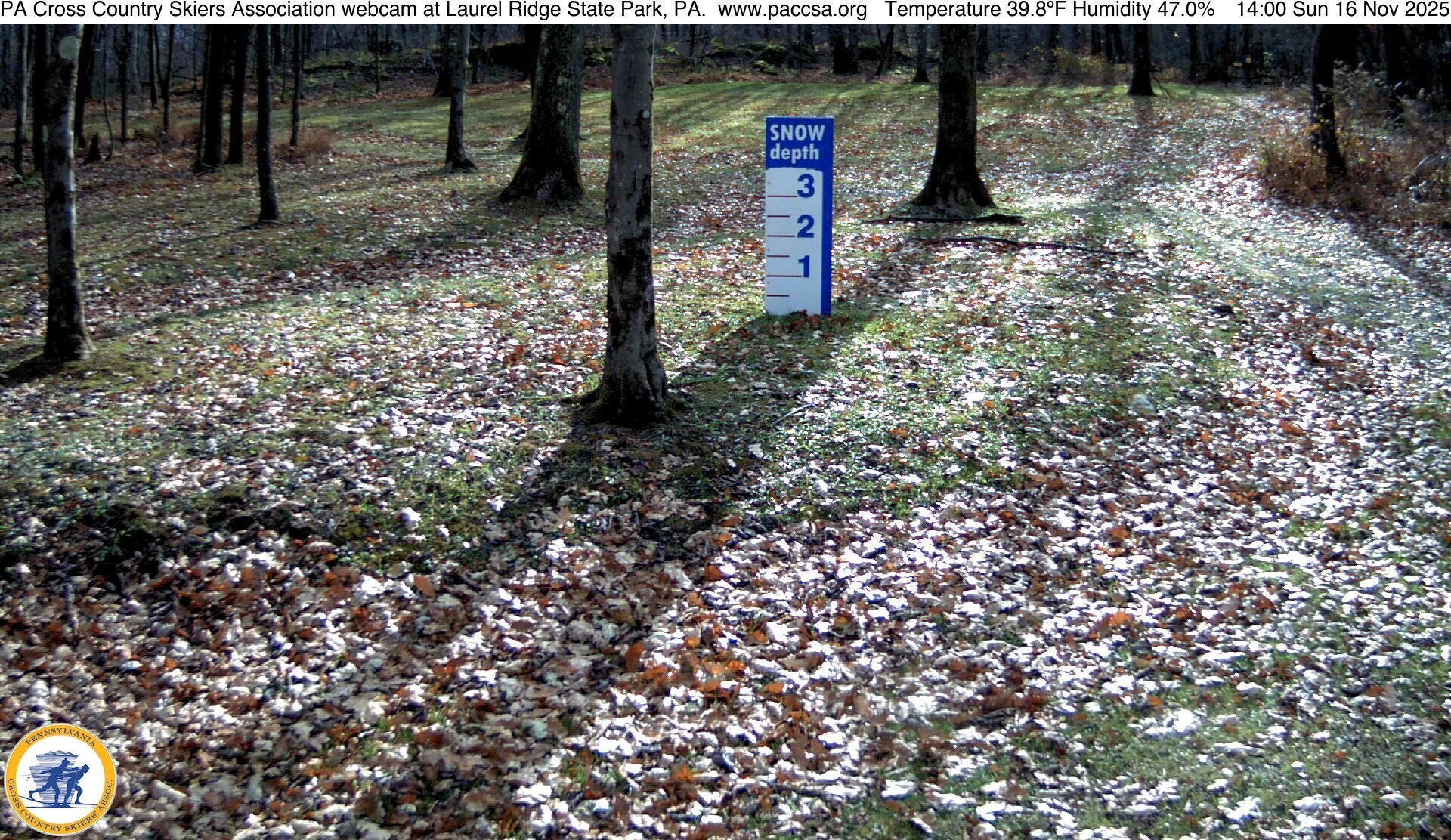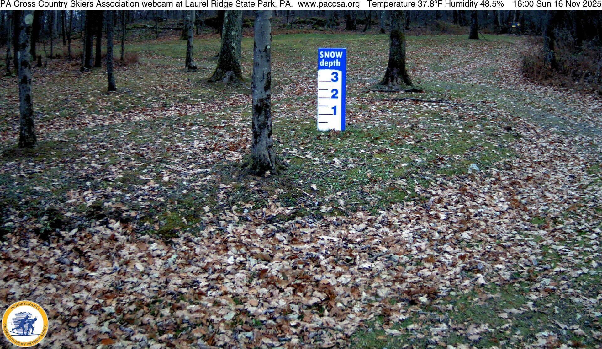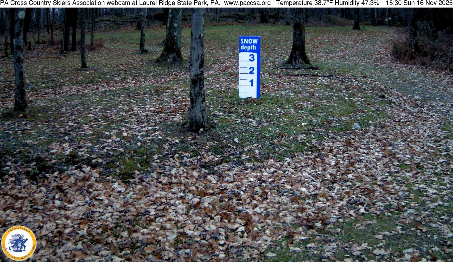 The webcam at Laurel Ridge State Park cross country ski area is owned and maintained by PACCSA, with the support of DCNR and donations from the public. Thank you to everyone who has contributed. The webcam operates from fall to spring, taking a photo of the ski area every half hour from sunrise to sunset. The ground elevation where it is sited is 852 m, 2795 ft.