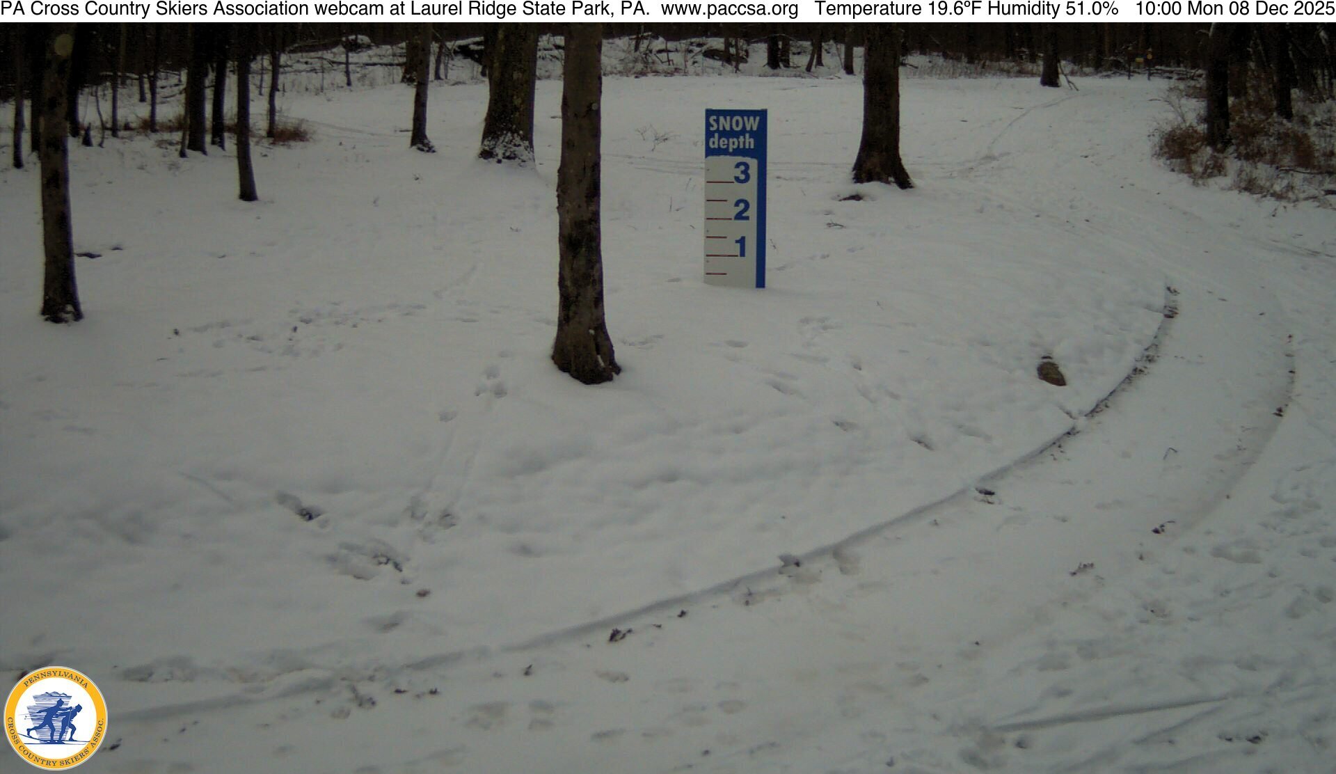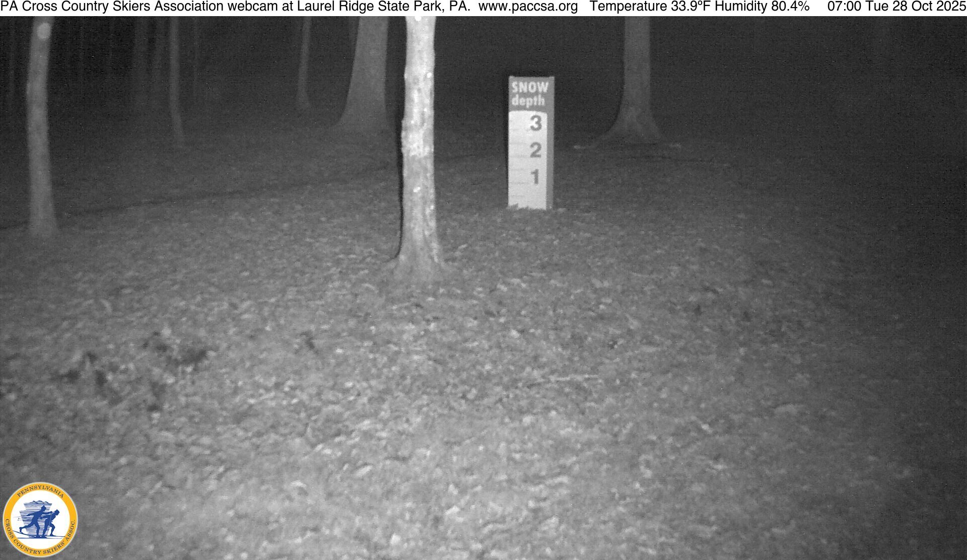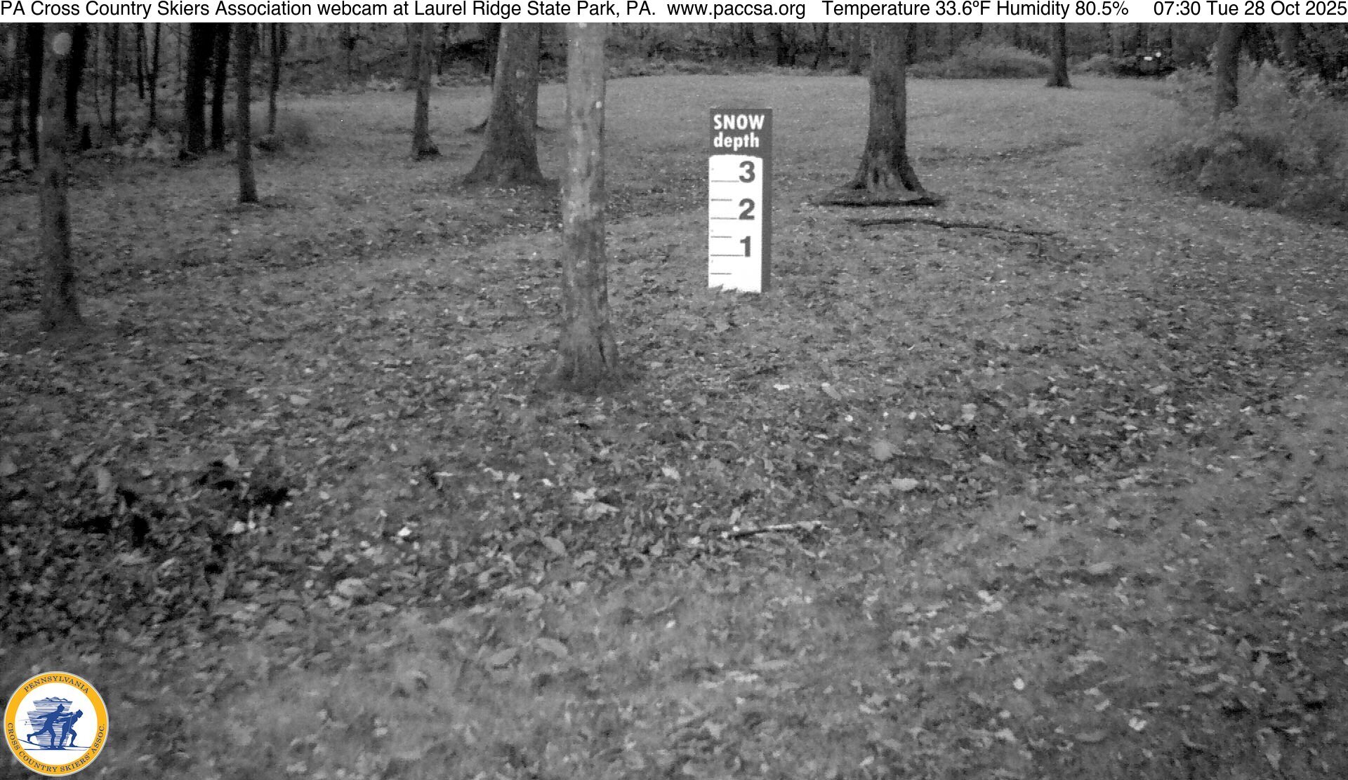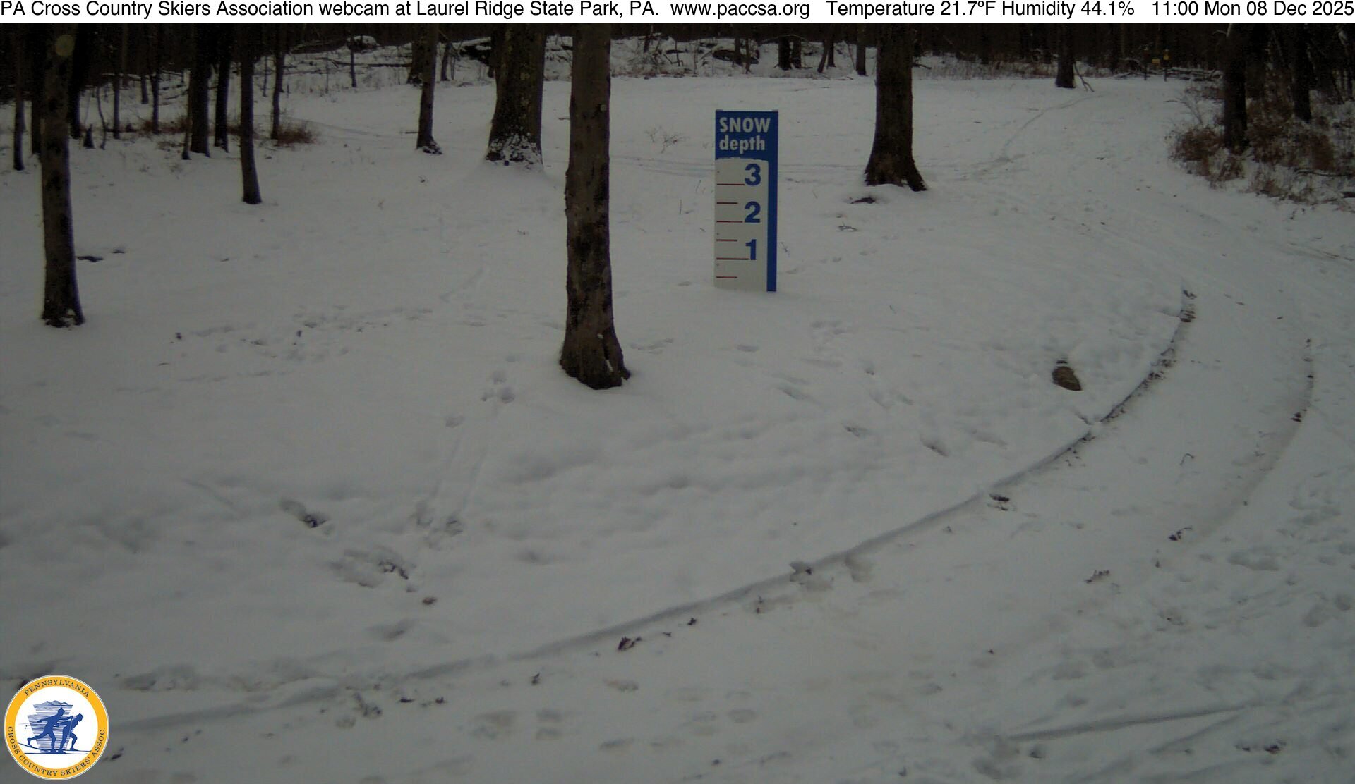 The webcam at Laurel Ridge State Park cross country ski area is owned and maintained by PACCSA, with the support of DCNR and donations from the public. Thank you to everyone who has contributed. The webcam operates from fall to spring, taking a photo of the ski area every half hour from sunrise to sunset. The ground elevation where it is sited is 852 m, 2795 ft.