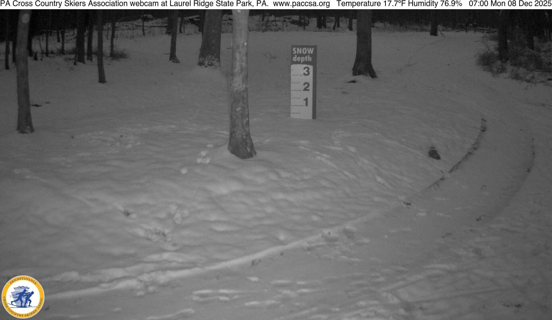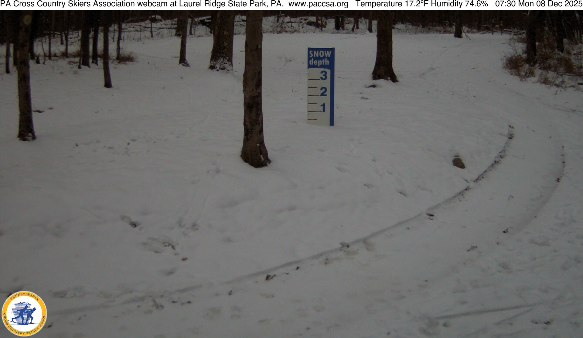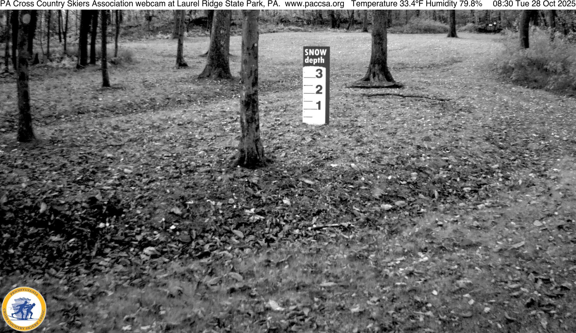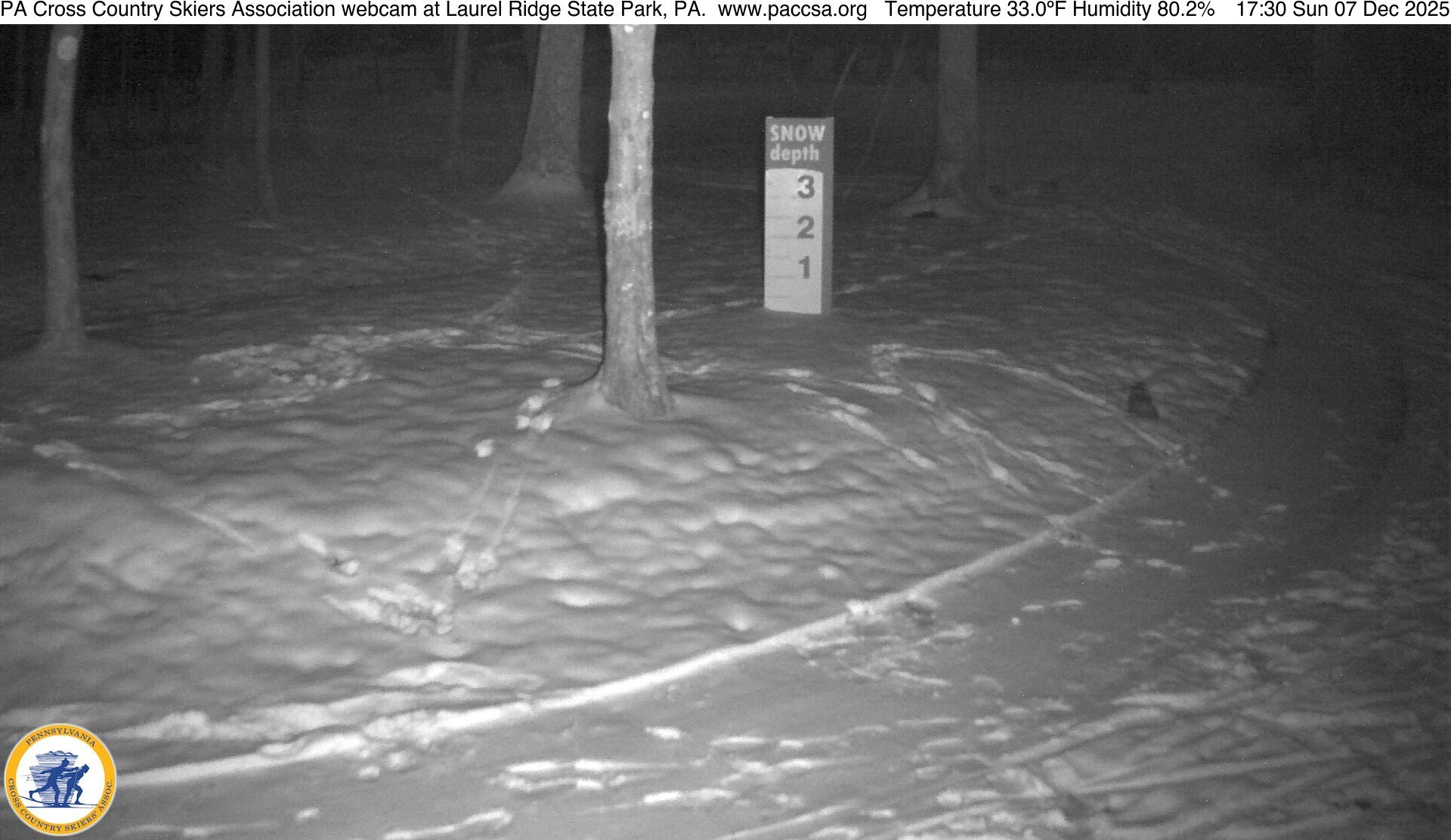 The webcam at Laurel Ridge State Park cross country ski area is owned and maintained by PACCSA, with the support of DCNR and donations from the public. Thank you to everyone who has contributed. The webcam operates from fall to spring, taking a photo of the ski area every half hour from sunrise to sunset. The ground elevation where it is sited is 852 m, 2795 ft.