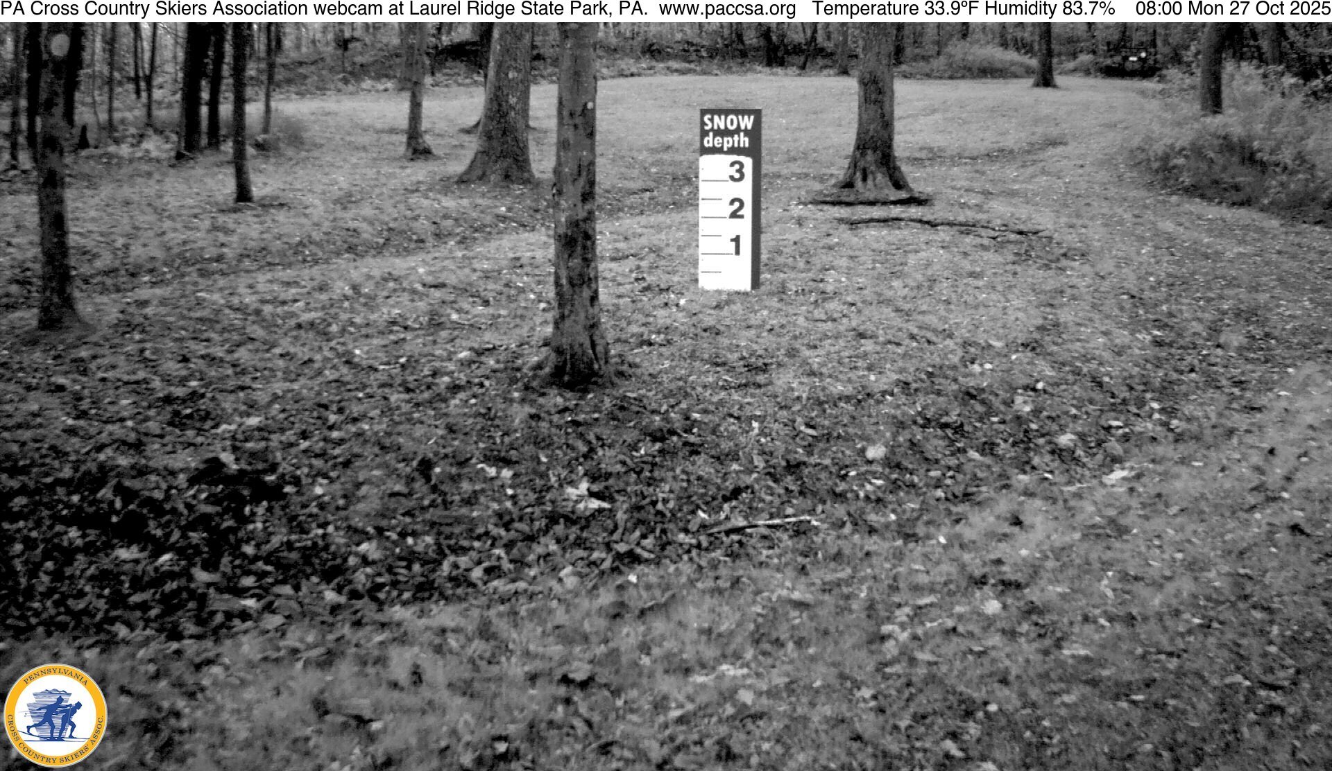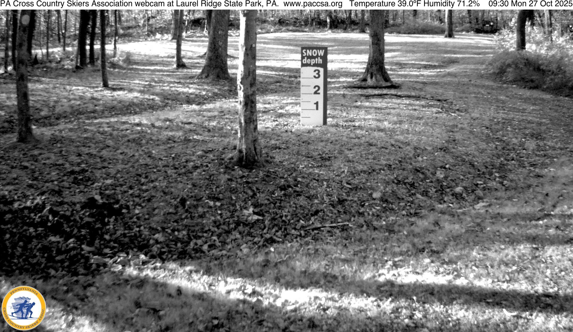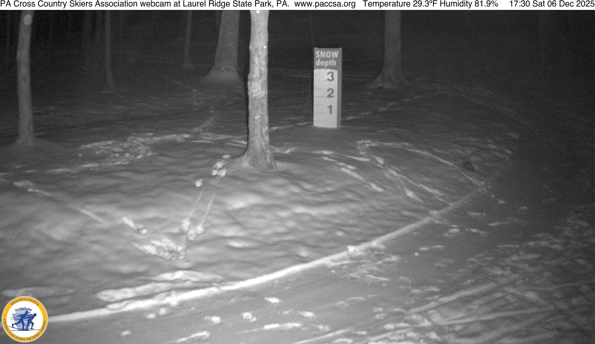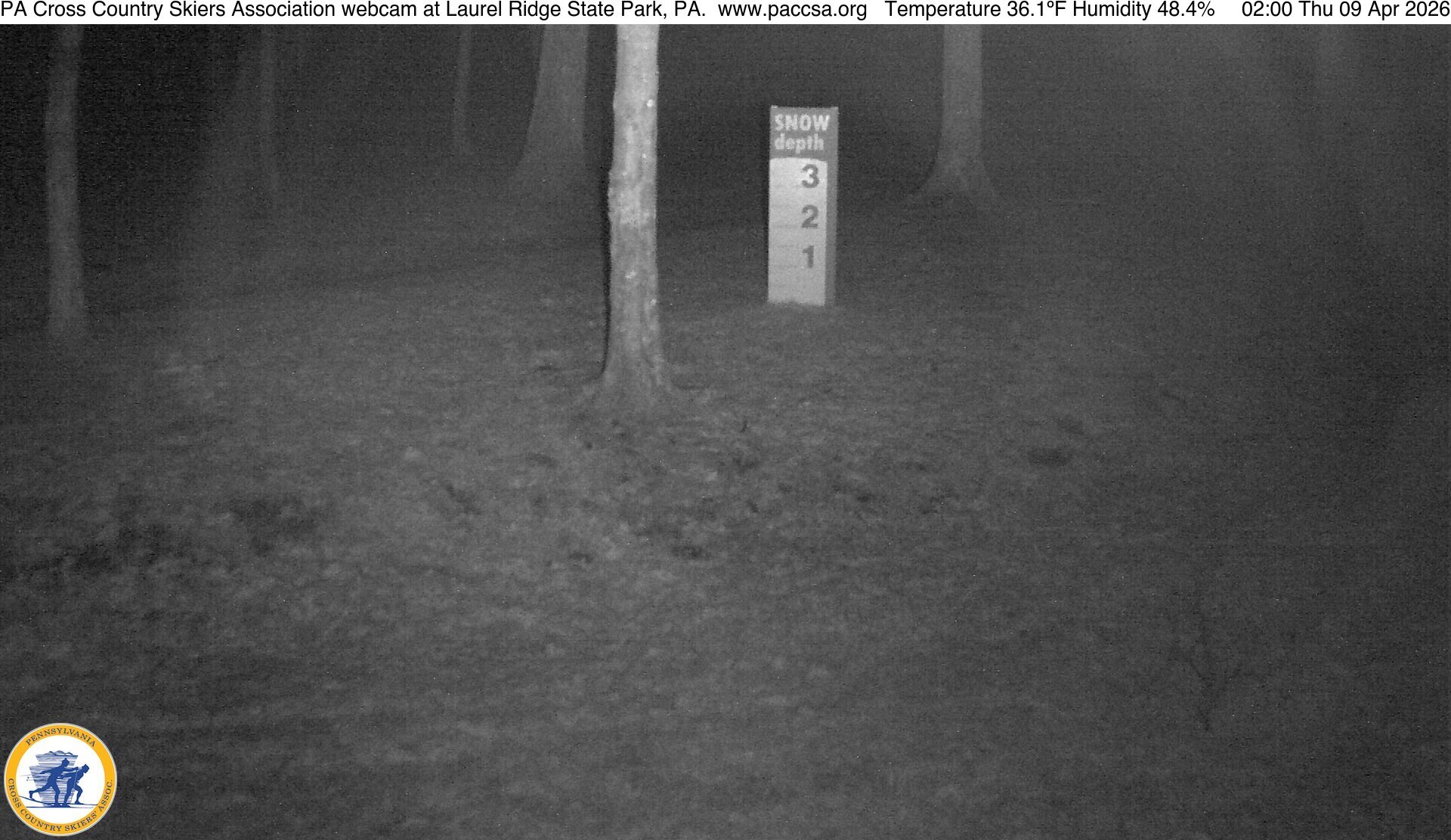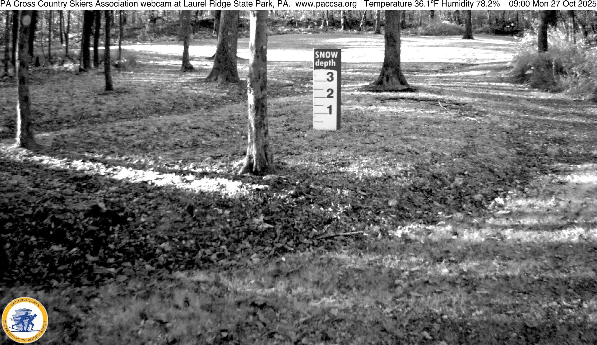 The webcam at Laurel Ridge State Park cross country ski area is owned and maintained by PACCSA, with the support of DCNR and donations from the public. Thank you to everyone who has contributed. The webcam operates from fall to spring, taking a photo of the ski area every half hour from sunrise to sunset. The ground elevation where it is sited is 852 m, 2795 ft.
