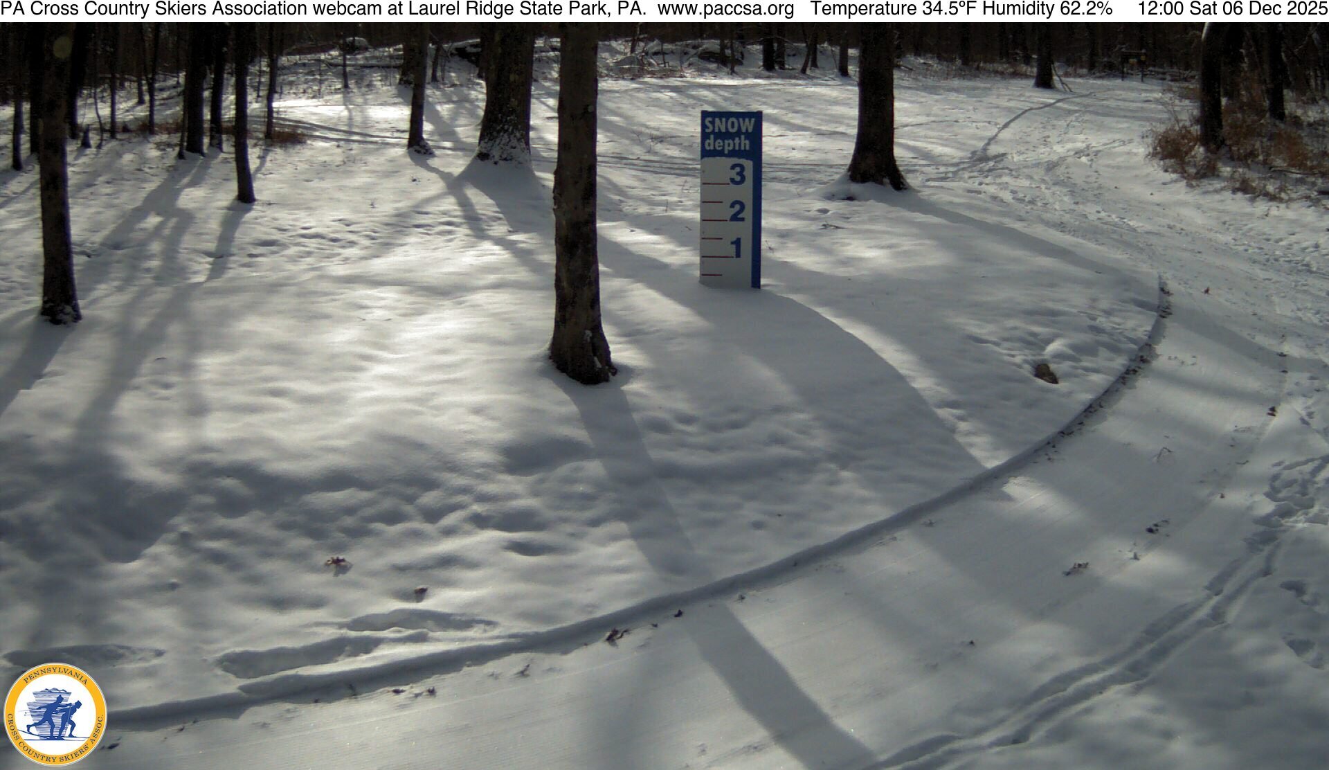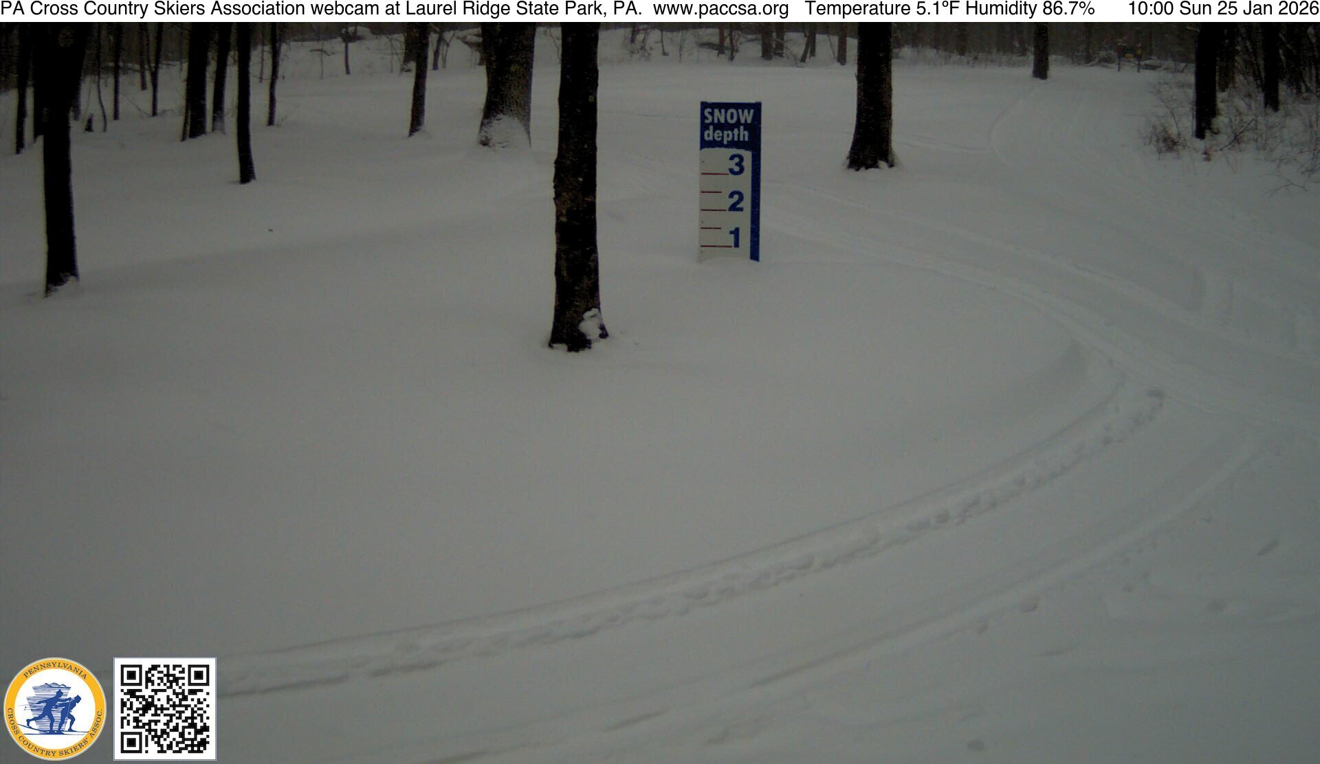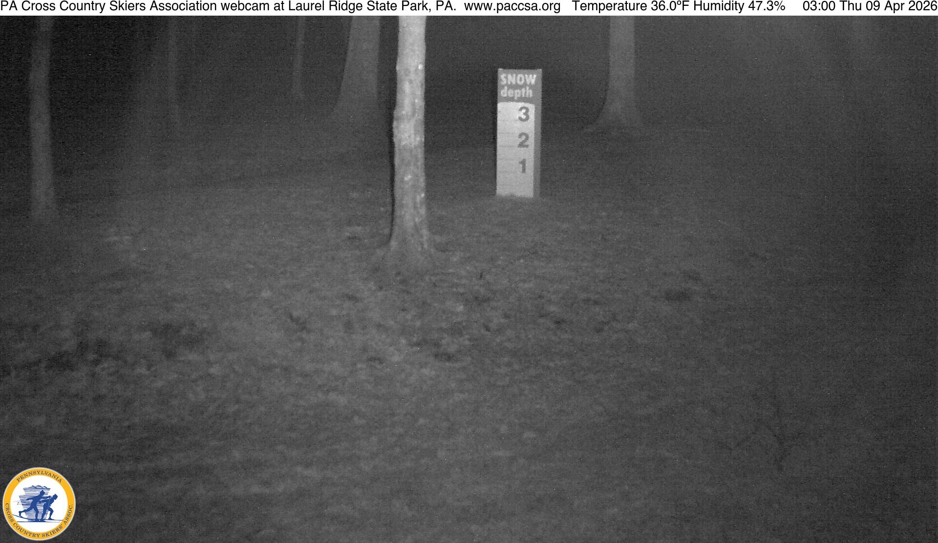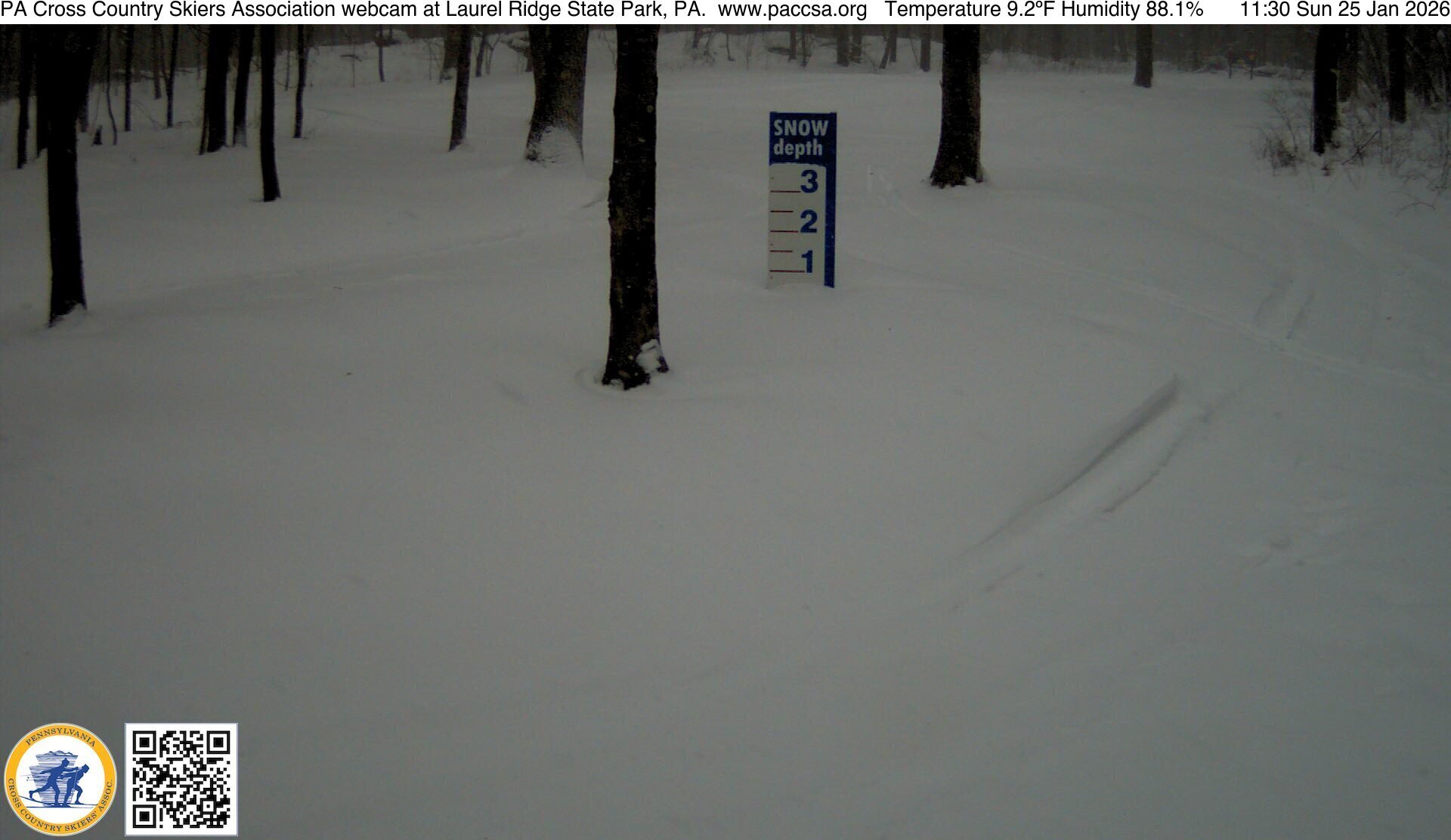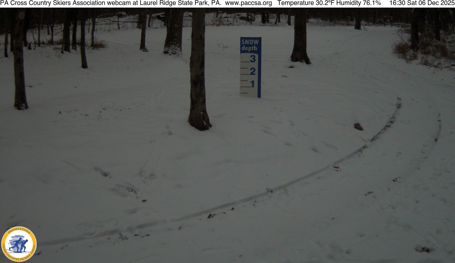 The webcam at Laurel Ridge State Park cross country ski area is owned and maintained by PACCSA, with the support of DCNR and donations from the public. Thank you to everyone who has contributed. The webcam operates from fall to spring, taking a photo of the ski area every half hour from sunrise to sunset. The ground elevation where it is sited is 852 m, 2795 ft.